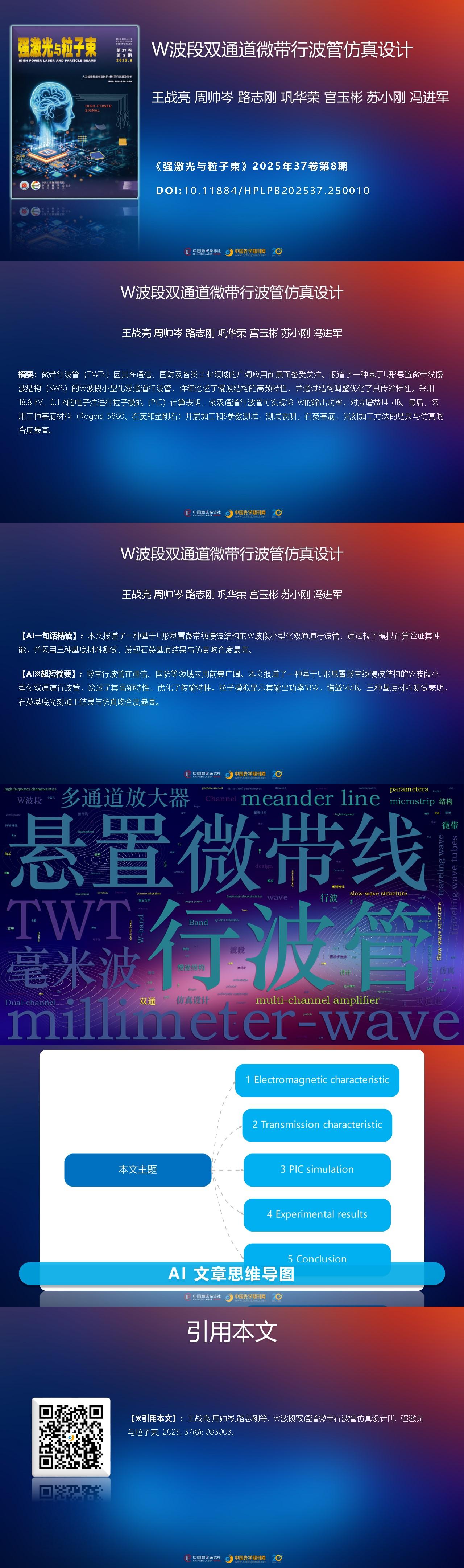 Traveling wave tubes (TWTs) play important roles in civilian, defense, industrial, and scientific application, including communication systems, radar systems, electronic countermeasure systems, environmental monitors, and deep space exploration[1-4]. Microstrip-based slow-wave structure (SWS) TWTs are particularly promising due to their advantages including wide bandwidth, lightweight, compact size, and suitability for mass production[4-7]. The first meander-line TWT was assembled in a microwave oven by A. W. Scott in 1969. Later, this group designed S- and X-band meander-line TWTs in 1973[8-9]. These early developments laid the groundwork for modern designs.