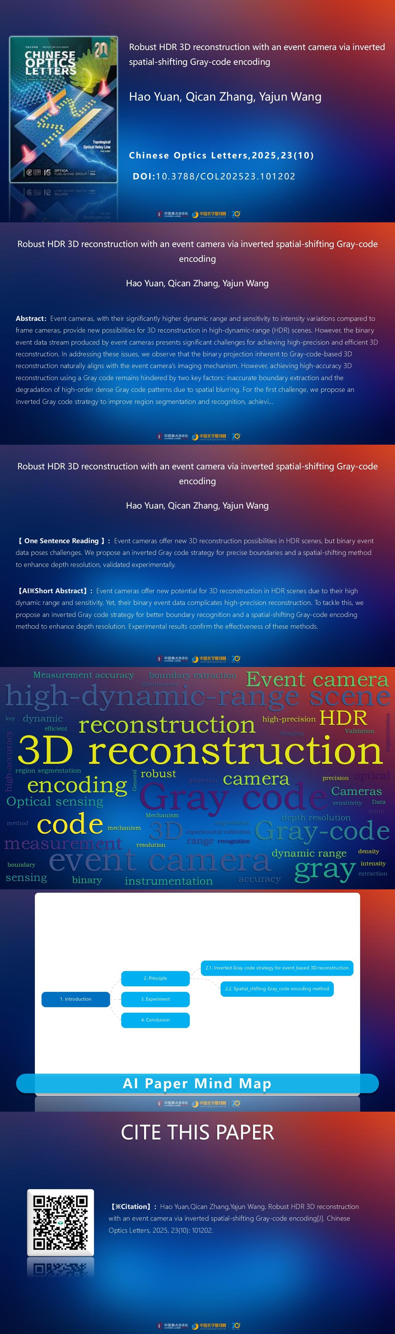 Hao Yuan, Qican Zhang, Yajun Wang, "Robust HDR 3D reconstruction with an event camera via inverted spatial-shifting Gray-code encoding," Chin. Opt. Lett. 23, 101202 (2025)