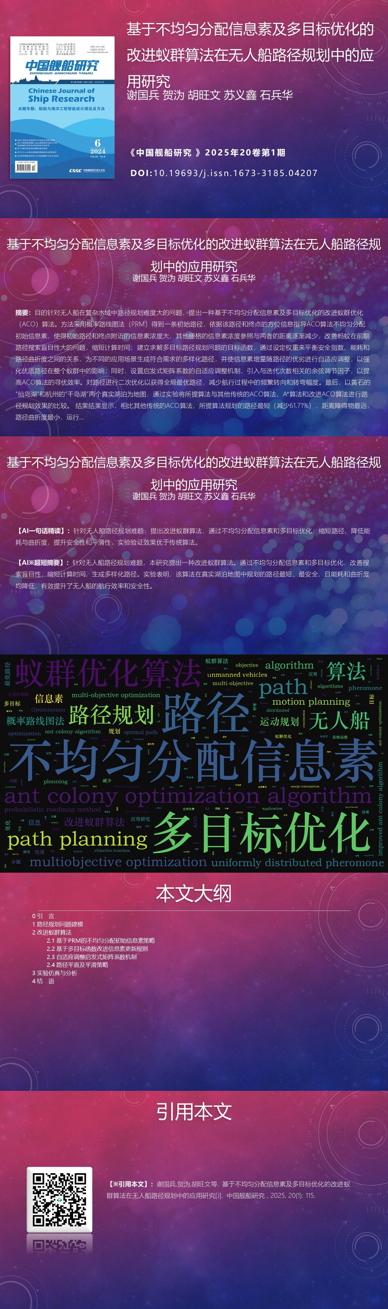 Guobing XIE, Wei HE, Wangwen HU, Yixin Su, Binghua SHI. Application of an improved ant colony algorithm based on unevenly distributed pheromone and multi-objective optimization in path planning for unmanned surface vehicles[J]. Chinese Journal of Ship Research, 2025, 20(1): 115