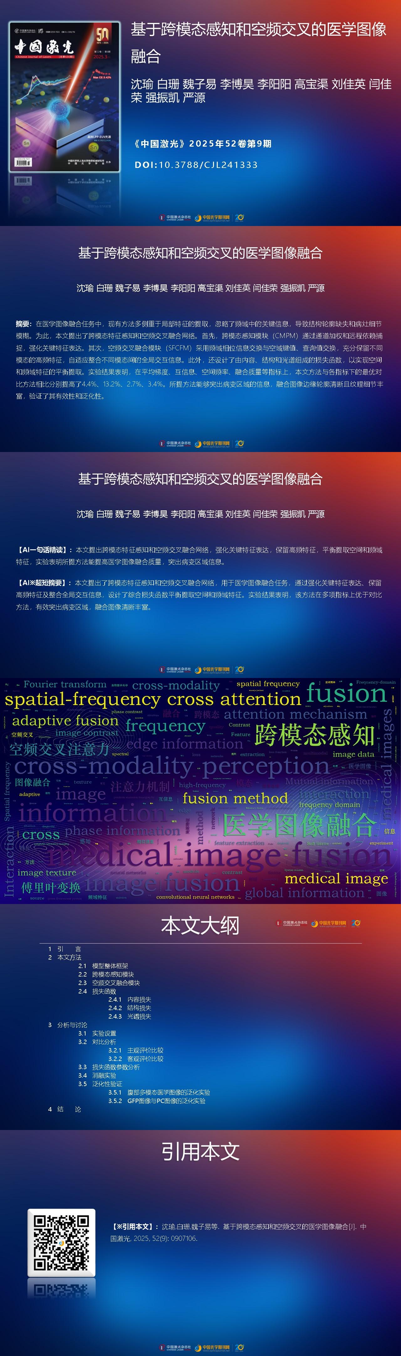 Yu Shen, Shan Bai, Ziyi Wei, Bohao Li, Yangyang Li, Baoqu Gao, Jiaying Liu, Jiarong Yan, Zhenkai Qiang, Yuan Yan. Medical Image Fusion Network for Cross‑Modality Perception and Spatial‑Frequency Interaction[J]. Chinese Journal of Lasers, 2025, 52(9): 0907106