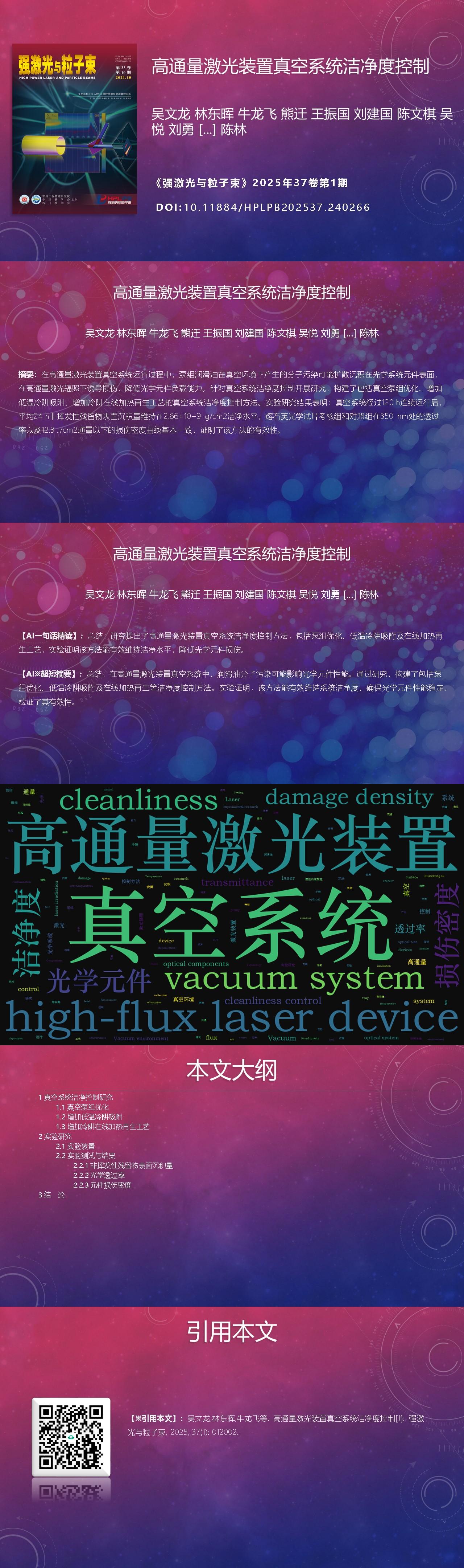 Wenlong Wu, Donghui Lin, Longfei Niu, Qian Xiong, Zhenguo Wang, Jianguo Liu, Wenqi Chen, Yue Wu, Yong Liu, Lin Wang, Ke Yao, Lin Chen. Cleanliness control of vacuum system in high-flux laser device[J]. High Power Laser and Particle Beams, 2025, 37(1): 012002