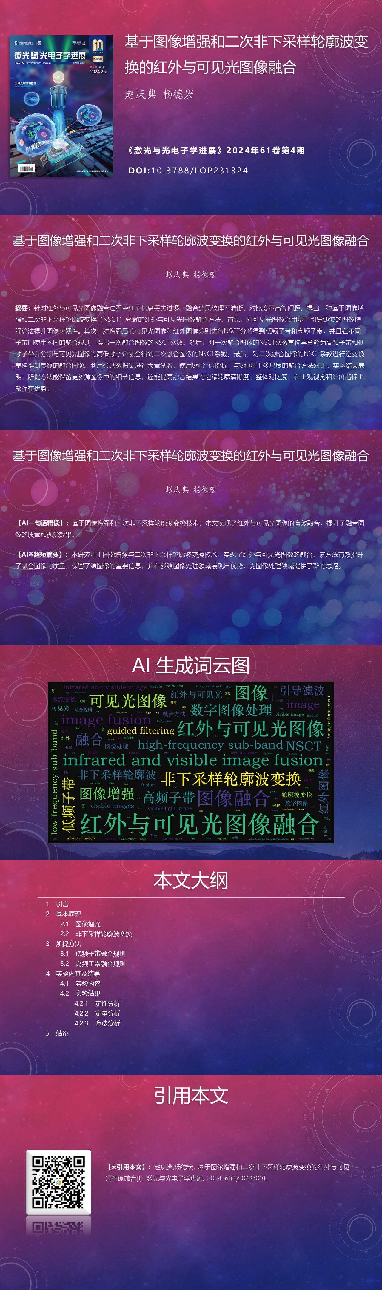 Qingdian Zhao, Dehong Yang. Infrared and Visible Light Image Fusion Based on Image Enhancement and Secondary Nonsubsampled Contourlet Transform[J]. Laser & Optoelectronics Progress, 2024, 61(4): 0437001
