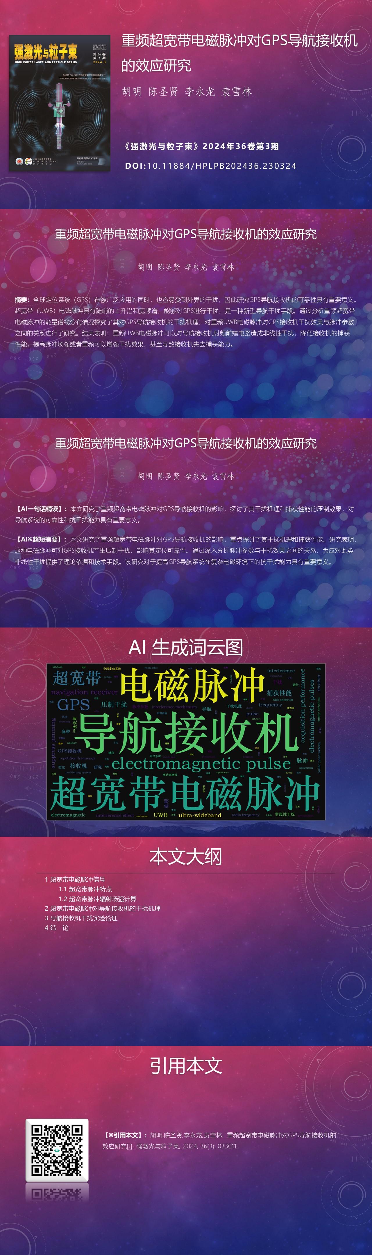 Ming Hu, Shengxian Chen, Yonglong Li, Xuelin Yuan. Influence of repeated frequency UWB electromagnetic pulse on GPS navigation receiver[J]. High Power Laser and Particle Beams, 2024, 36(3): 033011