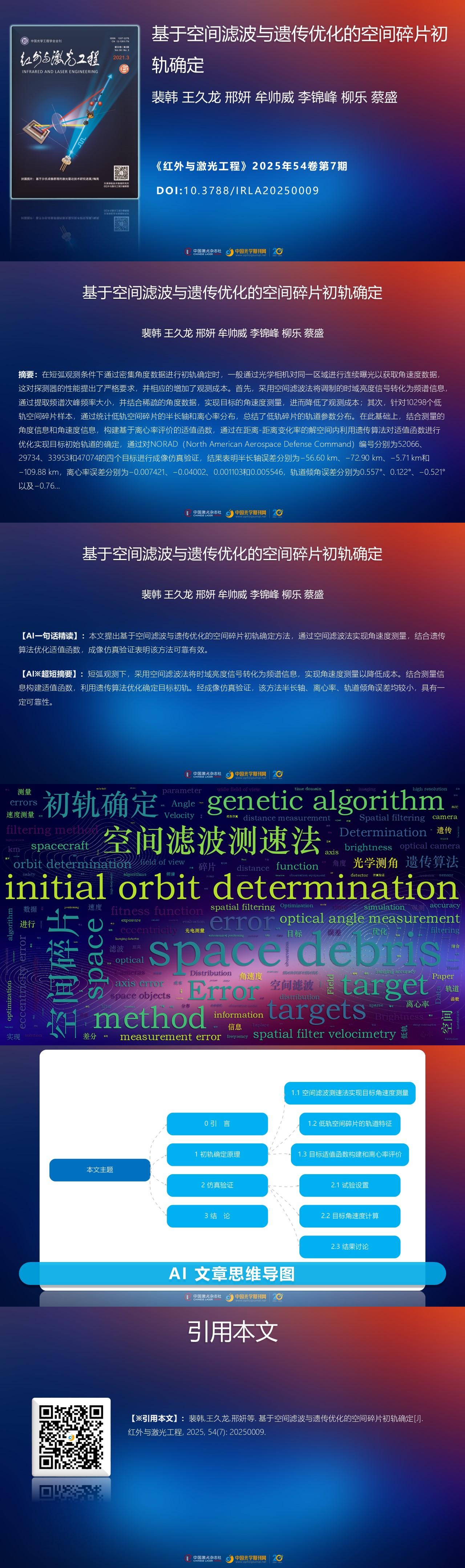 ObjectiveSpace debris mainly refers to all man-made objects except for normal spacecraft, including various satellites that have completed their missions, rocket bodies, waste in the process of performing space missions, and debris generated by the collision of space objects. These debris pose a great threat to the safety of spacecraft in orbit. With the continuous development of science and technology, space activities are becoming more and more frequent, which has led to an increasing number of space debris, posing a serious threat to the safety of spacecraft in orbit. Therefore, in order to reduce the impact of space debris on spacecraft, it is particularly important to carry out orbital monitoring and prediction of debris. Optical cameras play an important role in the field of space debris detection with their advantages of low energy consumption, high resolution and wide field of view coverage. Traditional initial orbit determination algorithms such as the Laplace method and the Gauss method are difficult to achieve the initial orbit determination of targets under short arc conditions due to the large error influence under short arc conditions. Some new methods based on dense data require optical cameras to continuously shoot targets. On the one hand, a large amount of data increases the burden on the system. On the other hand, continuous exposure of high-pixel optical cameras will cause overheating problems and affect the stability of the camera. Therefore, this paper proposes to use spatial filtering method to measure the angular velocity of the target, build the corresponding fitness function based on sparse angle data, and use genetic algorithm to optimize the initial orbit determination of the target.
