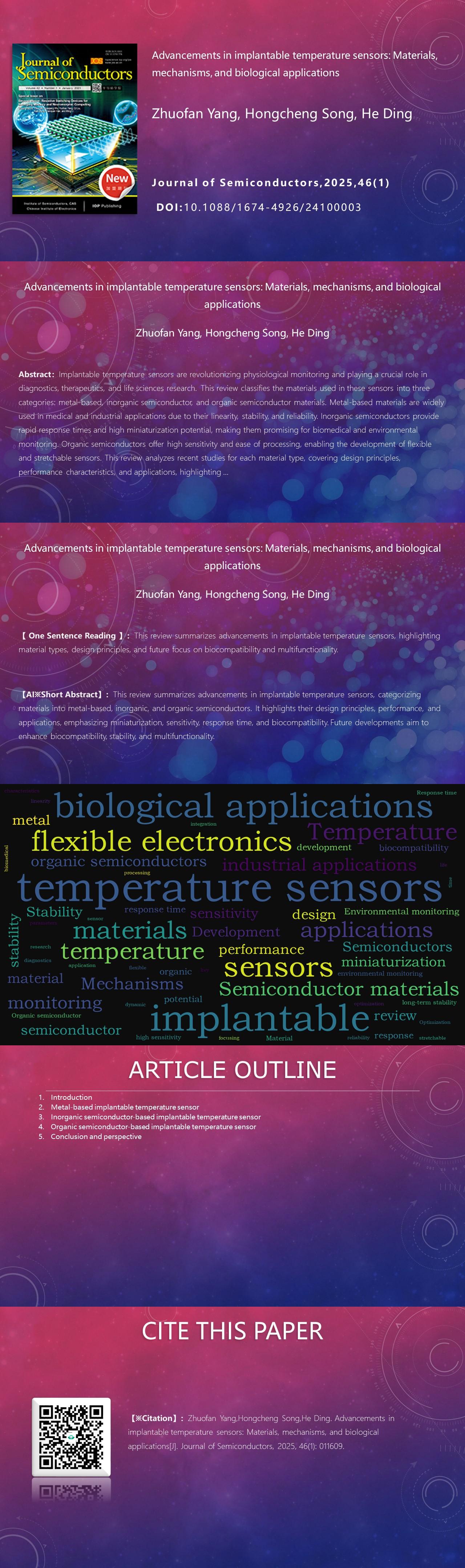 Over the past few decades, the field of implantable medical devices has made tremendous progress, with implantable temperature sensors fundamentally changing how we monitor and understand physiological states. These miniaturized, high-precision sensors can be directly implanted in the body to provide real-time, continuous temperature data, opening new prospects for medical diagnosis, treatment, and life science research[1, 2]. Body temperature, one of the most important physiological parameters, has always been a core indicator in medical diagnosis and health monitoring[3−6]. Conventional body temperature measurements, such as oral thermometers or handheld temperature guns, are straightforward and user-friendly. However, they can offer intermittent surface temperature data and might be influenced by the ambient temperature[7]. In contrast, implantable temperature sensors continuously monitor temperature changes in specific body parts, providing doctors and researchers with more comprehensive and accurate information[8−11]. The application range of implantable temperature sensors is broad. In clinical medicine, they can be used for early disease diagnosis, organ temperature monitoring during surgery, and chronic disease management. These sensors provide valuable neuroscience, drug development, and tissue engineering tools in life science research. Furthermore, in emerging fields such as remote medical care and environmental health monitoring, implantable temperature sensors show great potential[8, 9, 12].