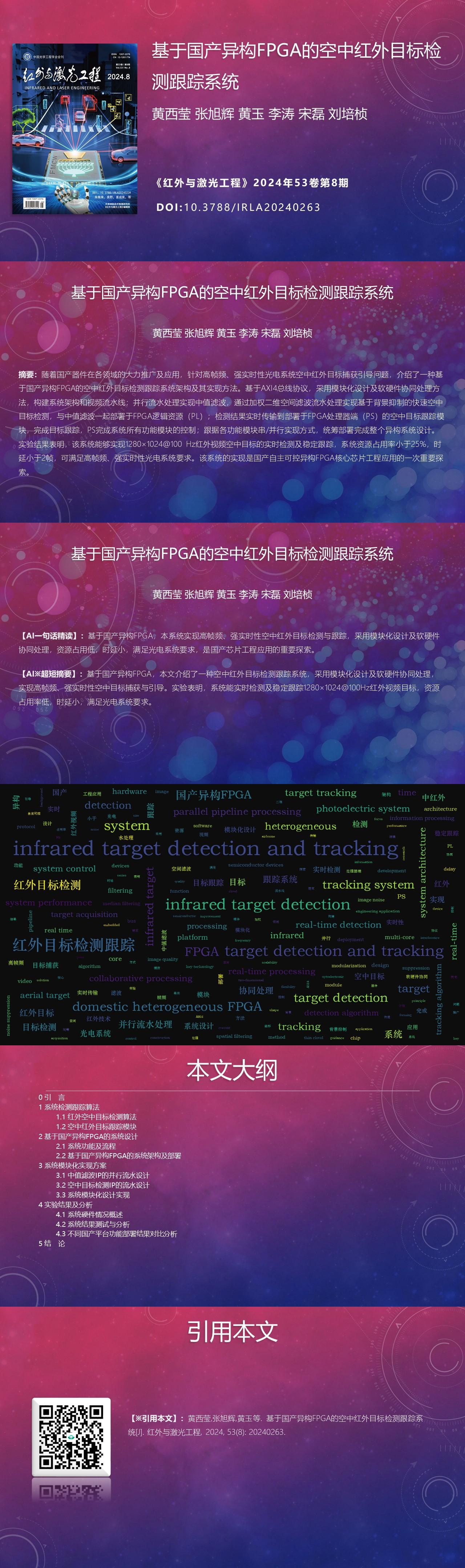 ObjectiveWith the rapid development of semiconductor devices, autonomous and controllable domestic multi-core heterogeneous FPGA devices have been vigorously promoted and applied in various fields, which has also promoted the development of optoelectronic information processing field. Infrared target detection and tracking technology has gradually become a key technology in this field. In the current photoelectric system, the principle design of airborne infrared target detection and tracking algorithm and its real-time improvement based on different hardware platforms have become a research focus. Domestic heterogeneous FPGA platform combined with multi-core ARM processor and FPGA logic resources, has strong system performance, flexibility and scalability, and becomes the preferred hardware platform for strong real-time processing system. Aiming at the problem of aerial infrared target acquisition and guidance in high-frame-rate and strong real-time photoelectric system, the architecture and implementation method of an aerial infrared target detection and tracking system based on domestic heterogeneous FPGA platform is proposed.