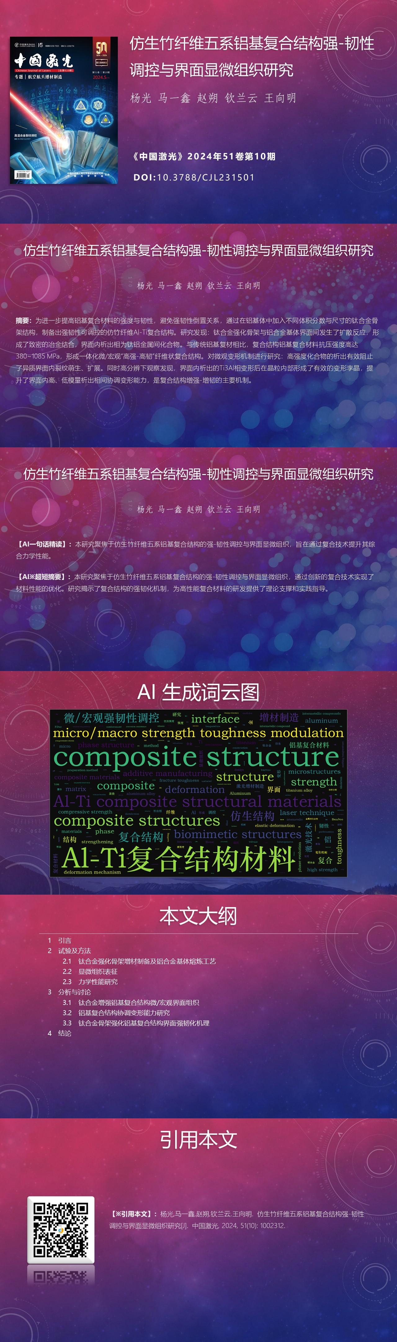 Guang Yang, Yixin Ma, Shuo Zhao, Lanyun Qin, Xiangming Wang. Strength-Toughness Modulation and Interfacial Microstructure of Bionic Bamboo Fiber-like Aluminum-Based Composite Structures (Invited)[J]. Chinese Journal of Lasers, 2024, 51(10): 1002312