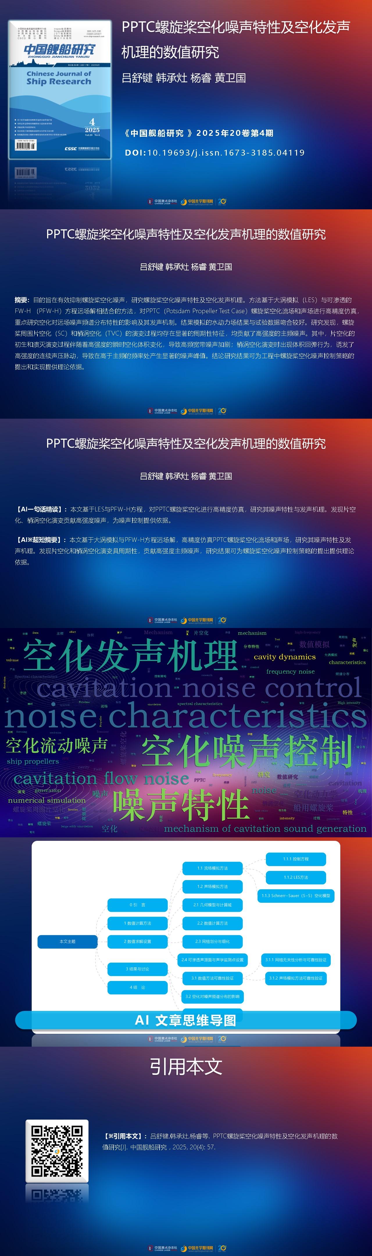Shujian LÜ, Chengzao HAN, Rui YANG, Weiguo HUANG. Numerical investigation of PPTC propeller cavitation noise characteristics and sound generation mechanism[J]. Chinese Journal of Ship Research, 2025, 20(4): 57