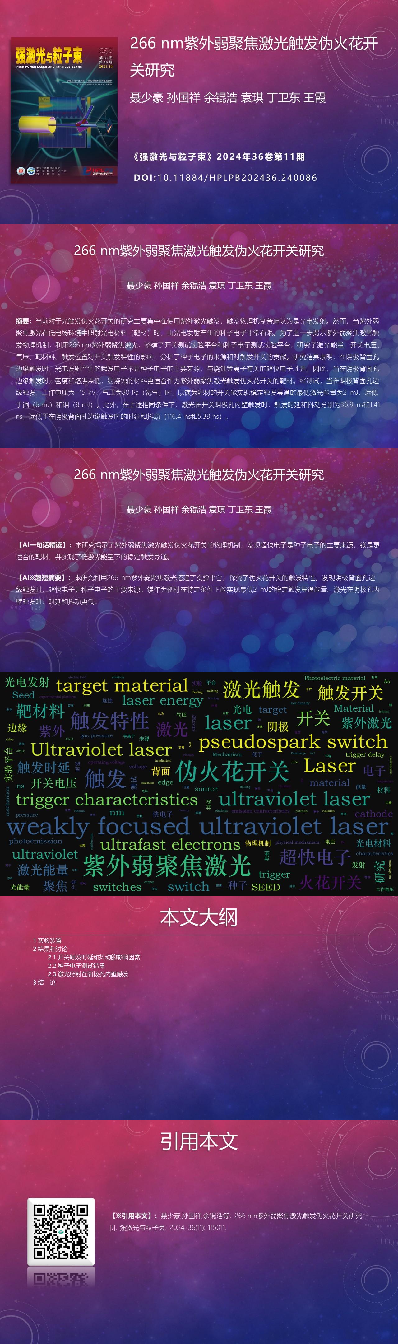 Shaohao Nie, Guoxiang Sun, Kunhao Yu, Qi Yuan, Weidong Ding, Xia Wang. Study on pseudospark switch triggered by weakly focused 266 nm ultraviolet laser[J]. High Power Laser and Particle Beams, 2024, 36(11): 115011