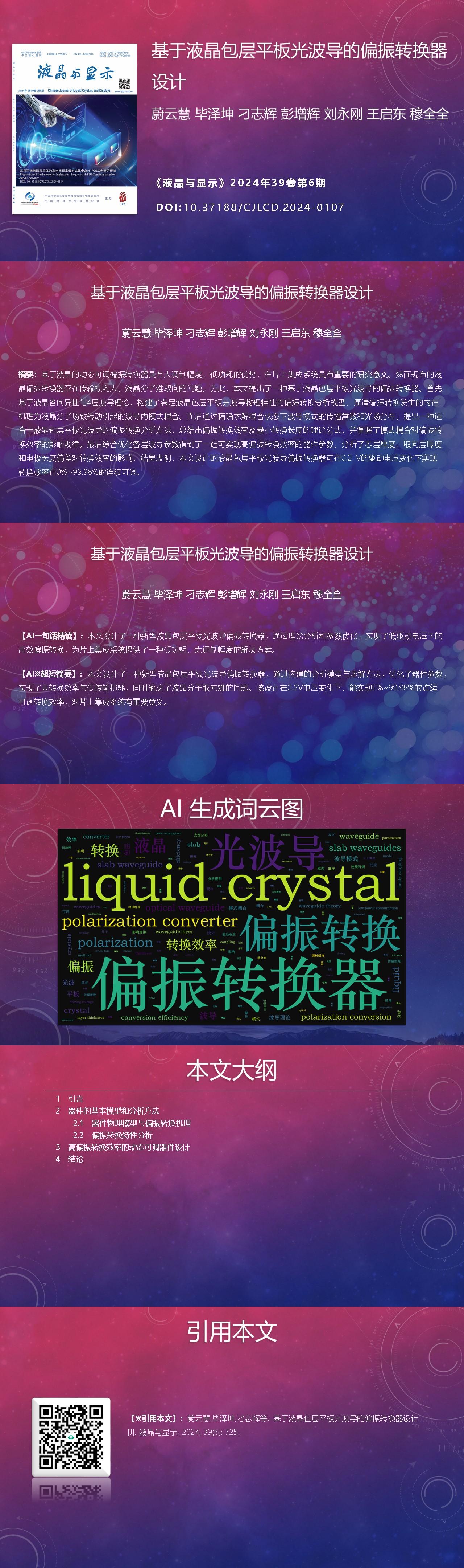 Yunhui YU, Zekun BI, Zhihui DIAO, Zenghui PENG, Yonggang LIU, Qidong WANG, Quanquan MU. Design of polarization converter based on liquid crystal-clad slab waveguide[J]. Chinese Journal of Liquid Crystals and Displays, 2024, 39(6): 725