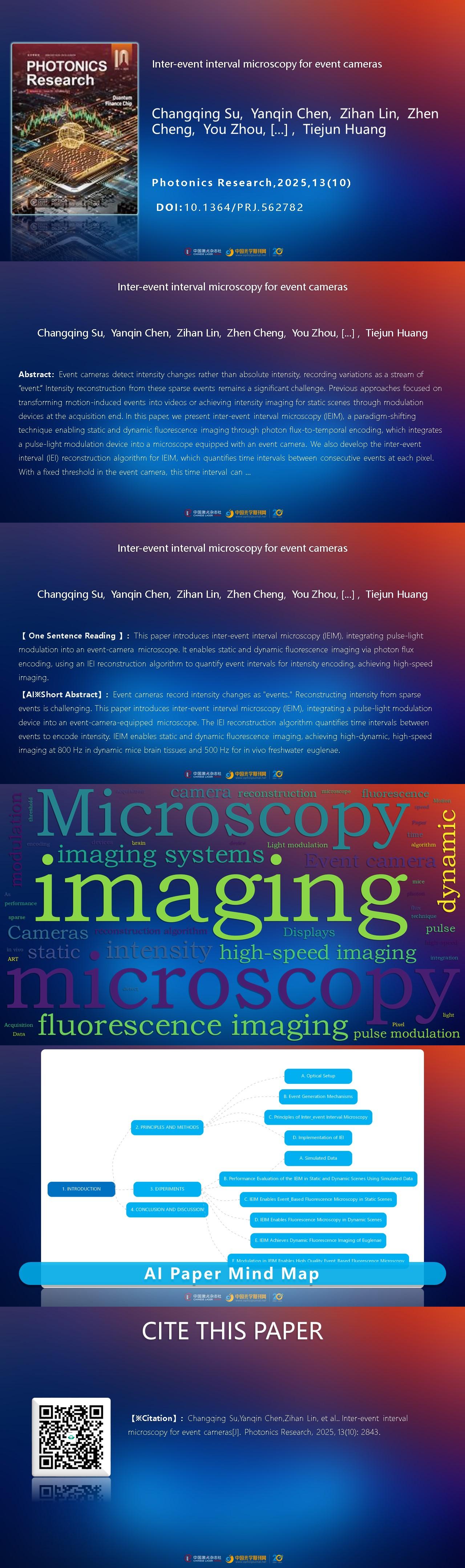 【AIGC Short Abstract】:Event cameras record intensity changes as "events." Reconstructing intensity from sparse events is challenging. This paper introduces inter-event interval microscopy (IEIM), integrating a pulse-light modulation device into an event-camera-equipped microscope. The IEI reconstruction algorithm quantifies time intervals between events to encode intensity. IEIM enables static and dynamic fluorescence imaging, achieving high-dynamic, high-speed imaging at 800 Hz in dynamic mice brain tissues and 500 Hz for in vivo freshwater euglenae.