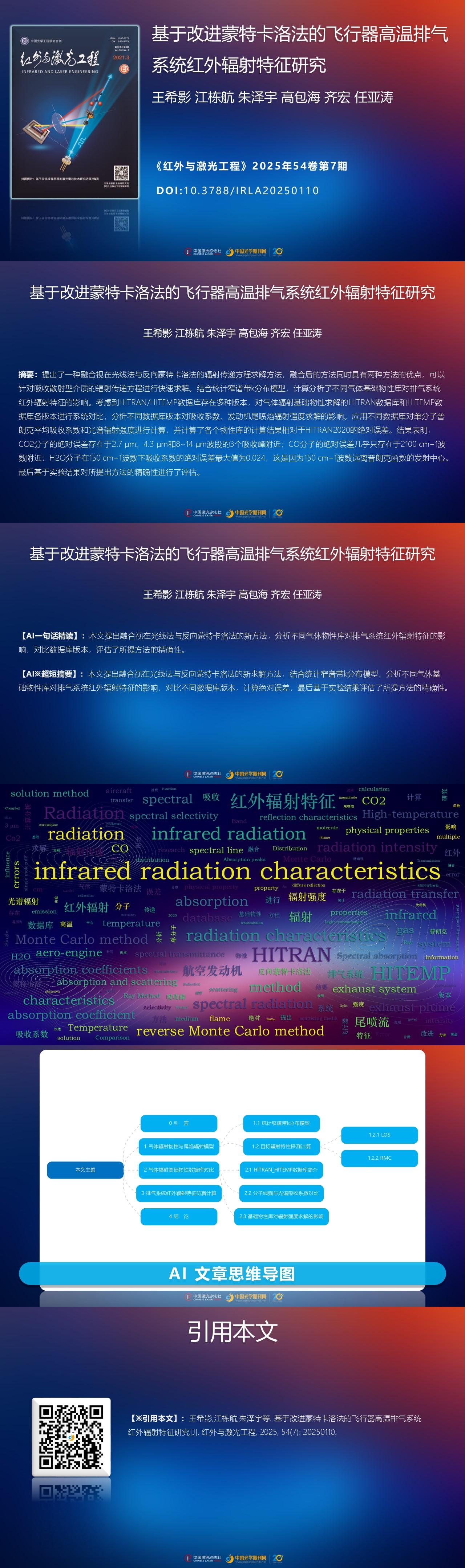 2, and CO molecules need to be considered. In addition to these molecules, the infrared radiation characteristics of the aircraft are also influenced by the high-temperature walls of the exhaust system. In this case, both the emitted radiation from the high-temperature wall and its diffuse reflection characteristics must be considered. Calculating the spectral physical properties of the tail flame medium represents the primary challenge in determining its infrared radiation characteristics.