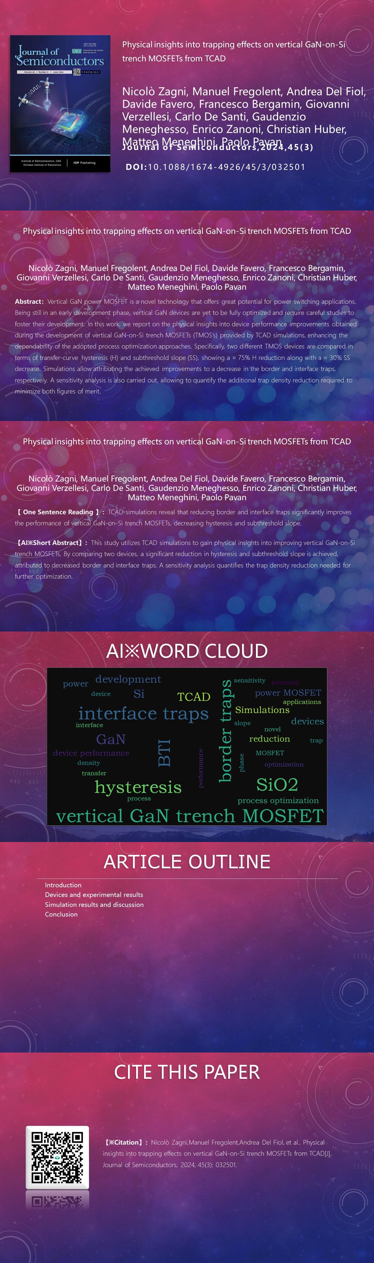 Nicolò Zagni, Manuel Fregolent, Andrea Del Fiol, Davide Favero, Francesco Bergamin, Giovanni Verzellesi, Carlo De Santi, Gaudenzio Meneghesso, Enrico Zanoni, Christian Huber, Matteo Meneghini, Paolo Pavan. Physical insights into trapping effects on vertical GaN-on-Si trench MOSFETs from TCAD[J]. Journal of Semiconductors, 2024, 45(3): 032501