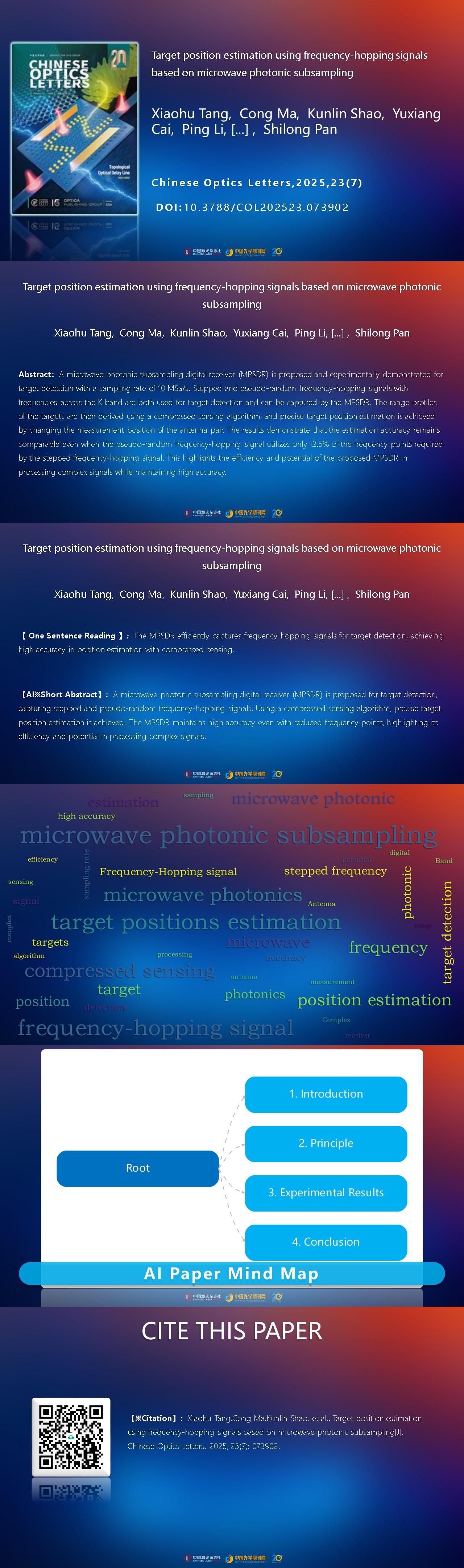 【AIGC Short Abstract】:A microwave photonic subsampling digital receiver (MPSDR) is proposed for target detection, capturing stepped and pseudo-random frequency-hopping signals. Using a compressed sensing algorithm, precise target position estimation is achieved. The MPSDR maintains high accuracy even with reduced frequency points, highlighting its efficiency and potential in processing complex signals.