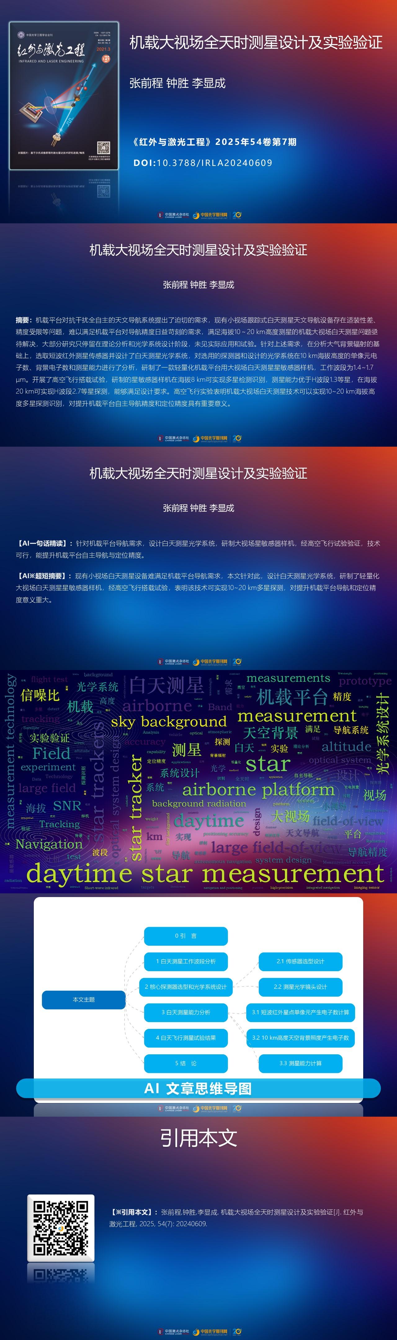 ConclusionsAccording to the requirements of a large field-of-view star tracker for an airborne platform, a 10-20 km airborne large field-of-view daytime star measurement technology has been proposed. The atmospheric background radiation, transmittance, and the daytime star measurement ability of the star tracker at the working altitude of the airborne platform were analyzed, including factors such as the number of electrons for each pixel and the number of sky background electrons at an altitude of 10 km. An engineering prototype was designed and a daytime star measurement experiment was conducted. The experimental data showed that the designed star tracker could achieve continuous and stable output at an altitude of more than 10 kilometers during the daytime. Additionally, for the first time, the daytime large field-of-view star measurement was successfully achieved at altitudes of 10-20 km. The daytime star measurement ability of the star tracker could reach the second-class star in the short-wave infrared H-band. High altitude flight tests have demonstrated that the airborne large field-of-view daytime star measurement technology can detect and identify multiple stars at altitudes of 10-20 km, which is of great significance in improving the autonomous navigation and positioning accuracy of airborne platforms.