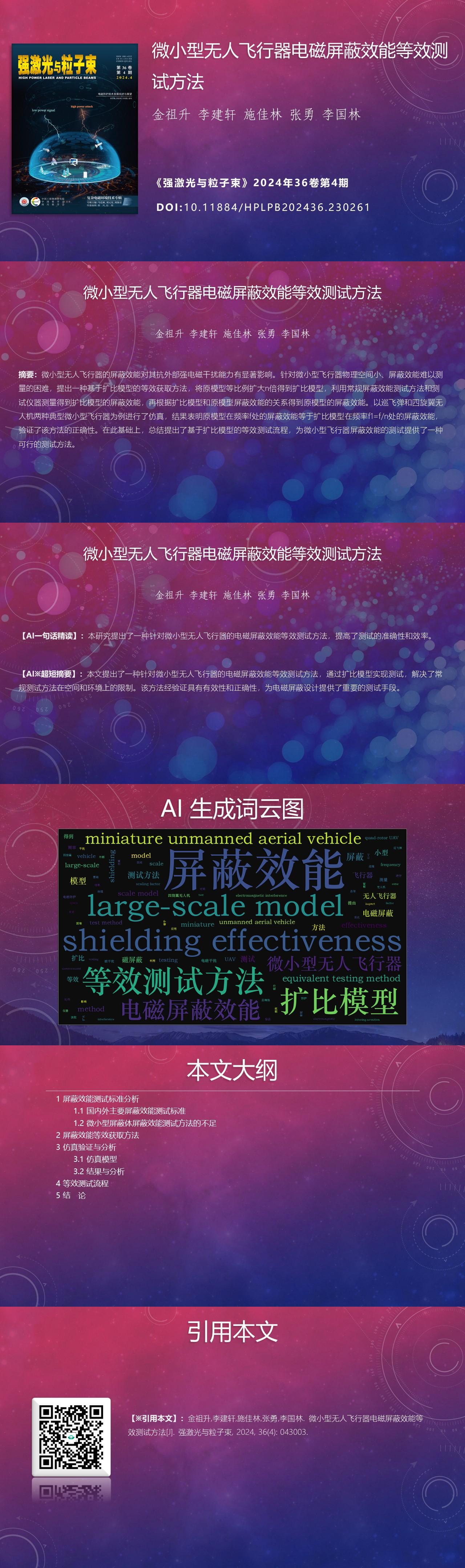 Zusheng Jin, Jianxuan Li, Jialin Shi, Yong Zhang, Guolin Li. Equivalent testing method for shielding effectiveness of miniature unmanned aerial vehicle[J]. High Power Laser and Particle Beams, 2024, 36(4): 043003