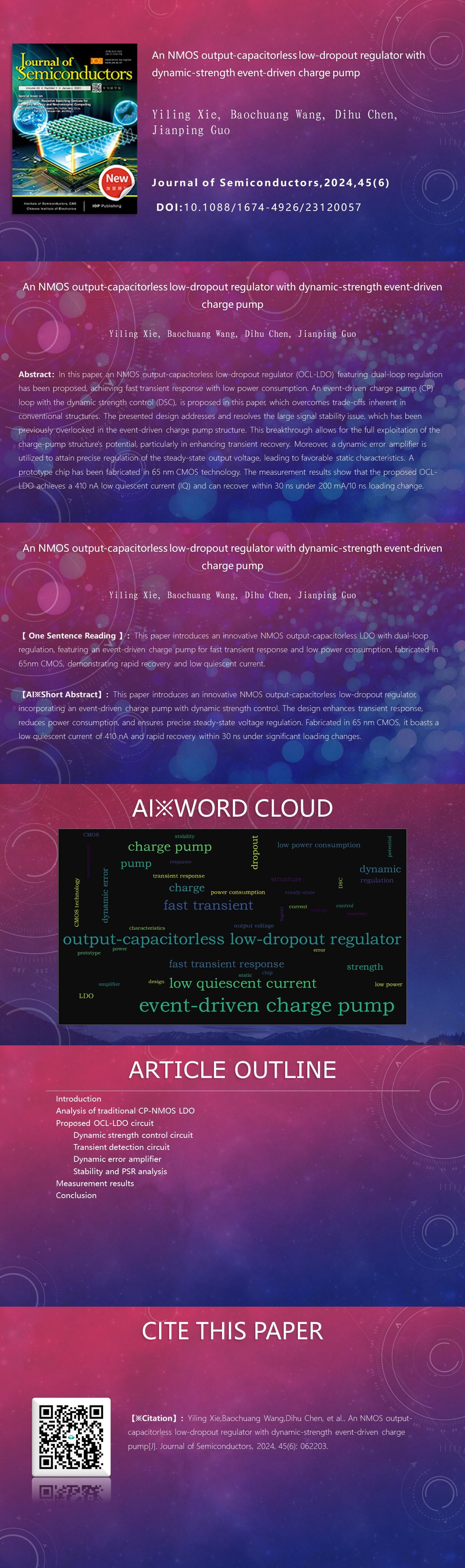 【AIGC Short Abstract】:This paper introduces an innovative NMOS output-capacitorless low-dropout regulator, incorporating an event-driven charge pump with dynamic strength control. The design enhances transient response, reduces power consumption, and ensures precise steady-state voltage regulation. Fabricated in 65 nm CMOS, it boasts a low quiescent current of 410 nA and rapid recovery within 30 ns under significant loading changes.