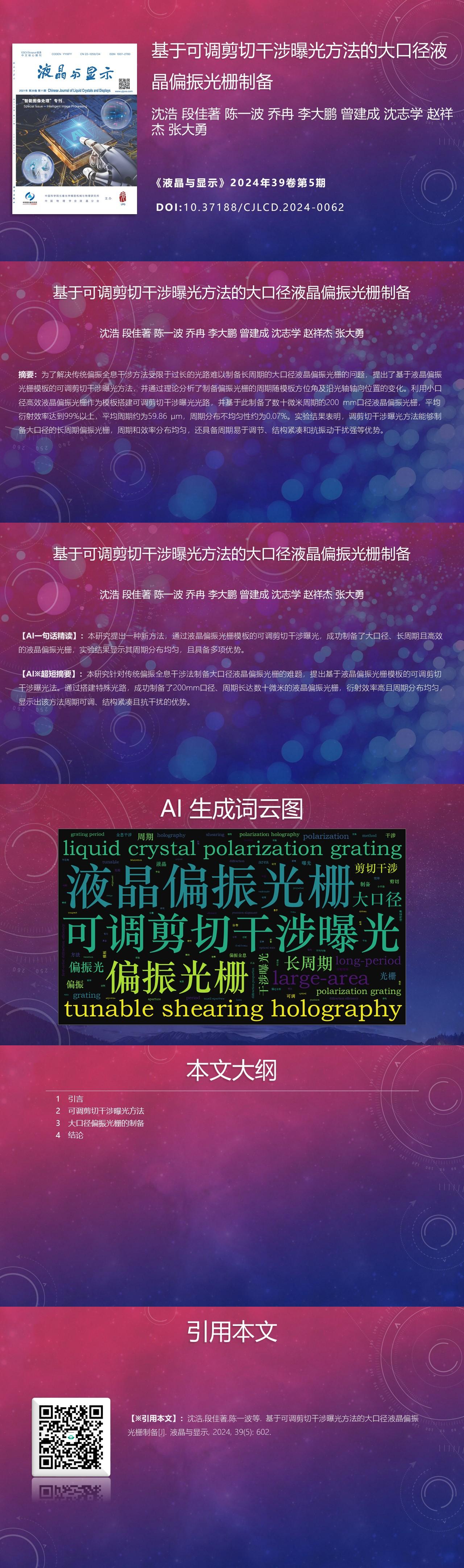 Hao SHEN, Jiazhu DUAN, Yibo CHEN, Ran QIAO, Dapeng LI, Jiancheng ZENG, Zhixue SHEN, Xiangjie ZHAO, Dayong ZHANG. Fabrication method of large-area polarization grating based on tunable shearing holography[J]. Chinese Journal of Liquid Crystals and Displays, 2024, 39(5): 602
