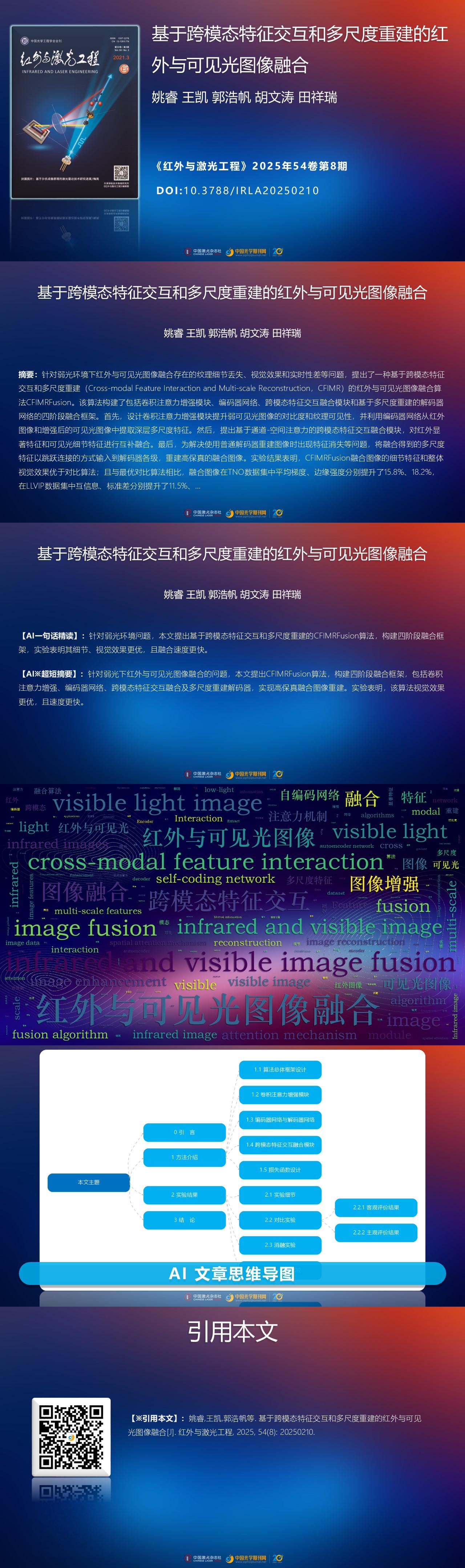 ConclusionsA novel infrared and visible light image fusion algorithm based on cross-modal feature interaction and multi-scale reconstruction, CFIMRFusion, has been developed, to enhance information acquisition in low-light conditions and produce fused images with clear details and improved visual effects. Initially, the degraded visible light image is fed into a convolutional attention enhancement module to obtain enhanced features. Subsequently, the enhanced visible light image and the infrared image are fed an autoencoder network to extract multi-scale features, which are then complementarily fused via a cross-modal feature interaction fusion module. Finally, a decoder network based on multi-scale reconstruction is employed to generate the fused image with rich details and clear structures. Experimental results indicate that, compared to the optimal comparison algorithm, the fused images of CFIMRFusion achieved 15.8% and 18.2% increase in average gradient and edge intensity, respectively, on the TNO dataset; 11.5% and 9.5% increase in mutual information and standard deviation on the LLVIP dataset; and 10.1% increase in edge intensity in the MSRS dataset. Moreover, ablation studies further demonstrate the effectiveness of each module in the algorithm, where the complete model outperforms partial module combinations in terms of AG, EI, SD, SF, and VIF metrics. Regarding computational efficiency, the proposed CFIMRFusion algorithm achieves the shortest average runtime and is thus capable of satisfying the real-time requirements of applications in low-light scenarios with high temporal constraints.