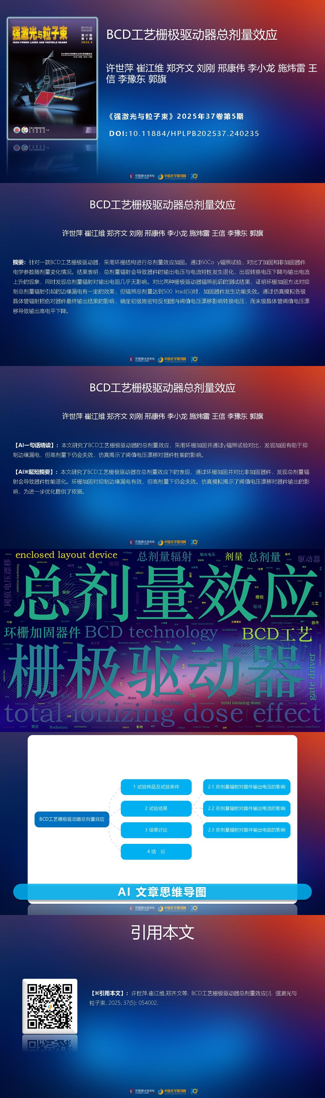 Shiping Xu, Jiangwei Cui, Qiwen Zheng, Gang Liu, Kangwei Xing, Xiaolong Li, Weilei Shi, Xin Wang, Yudong Li, Qi Guo. Total ionizing dose effect on gate drivers fabricated by BCD technology[J]. High Power Laser and Particle Beams, 2025, 37(5): 054002