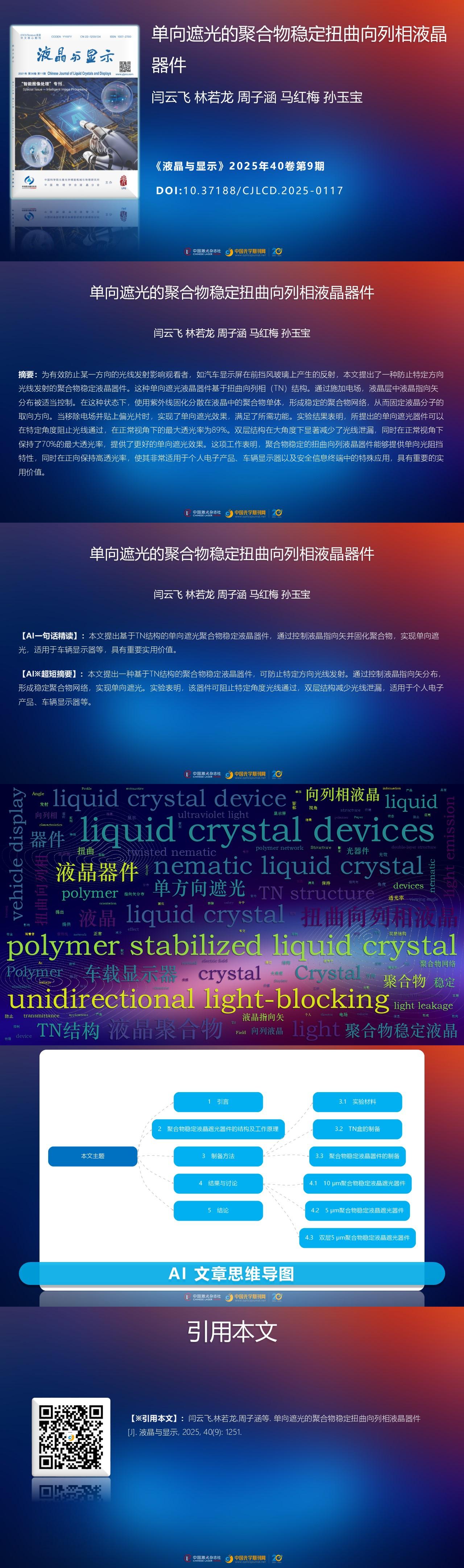 Yunfei YAN, Ruolong LIN, Zihan ZHOU, Hongmei MA, Yubao SUN. Polymer-stabilized twisted nematic liquid crystal devices with unidirectional light-blocking[J]. Chinese Journal of Liquid Crystals and Displays, 2025, 40(9): 1251