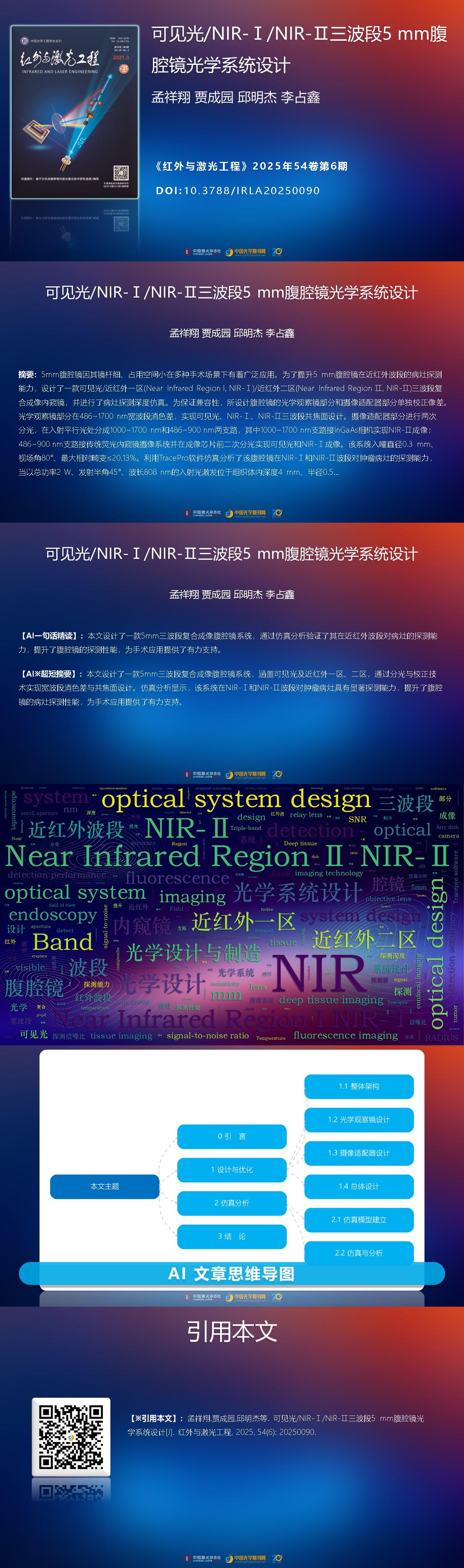 ConclusionsA 5 mm fluorescence laparoscope with visible/NIR-Ⅰ/NIR-Ⅱ composite imaging was designed. Simulation analysis shows that the NIR-Ⅱ band has a higher signal-to-noise ratio compared with the NIR-Ⅰ band at the same tissue depth, which can effectively detect deeper tumours and improve the sensitivity and accuracy of tumour detection. Multi-band imaging technology enables laparoscopy to show higher flexibility and accuracy in complex tissue environments, which can meet the needs of deeper tumour detection and can enhance the detection performance of 5 mm laparoscopy for tumour lesions.
