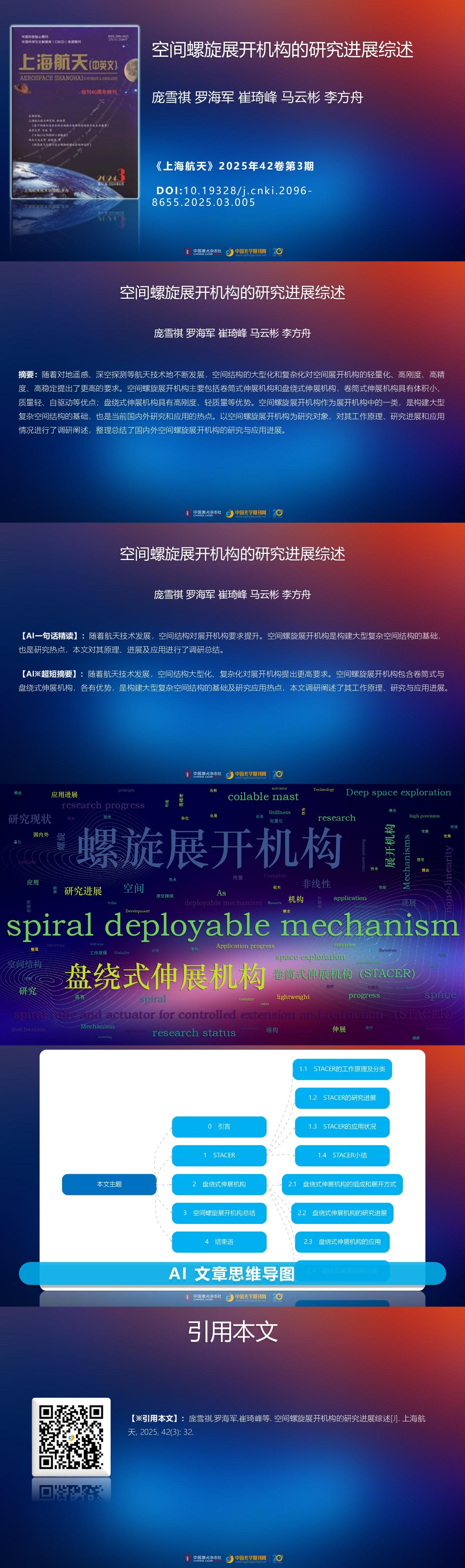 With the continuous development of space technology,such as earth remote sensing of and deep space exploration,the space structure is becoming more and more large and complex,resulting in higher requirements for the lightweight,high stiffness,high precision,high stability,and high deployment ratio of space deployable mechanisms.The space spiral deployable mechanism mainly includes the spiral tube and actuator for controlled extension and retraction (STACER) and the coilable mast.The STACER has the advantages such as small volume,lightweight,and self-driven,and the coilable mast has the advantages such as high stiffness and lightweight.As a class of deployable mechanisms,the space spiral deployable mechanism is the basis for the construction of large and complex space structures,and is currently a hot topic of research and application at home and abroad.The working principle,research progress,and application of the space spiral deployable mechanism,as the research object,are investigated and elaborated,and the research and application progress of space spiral deployable mechanisms at home and abroad is summarized.