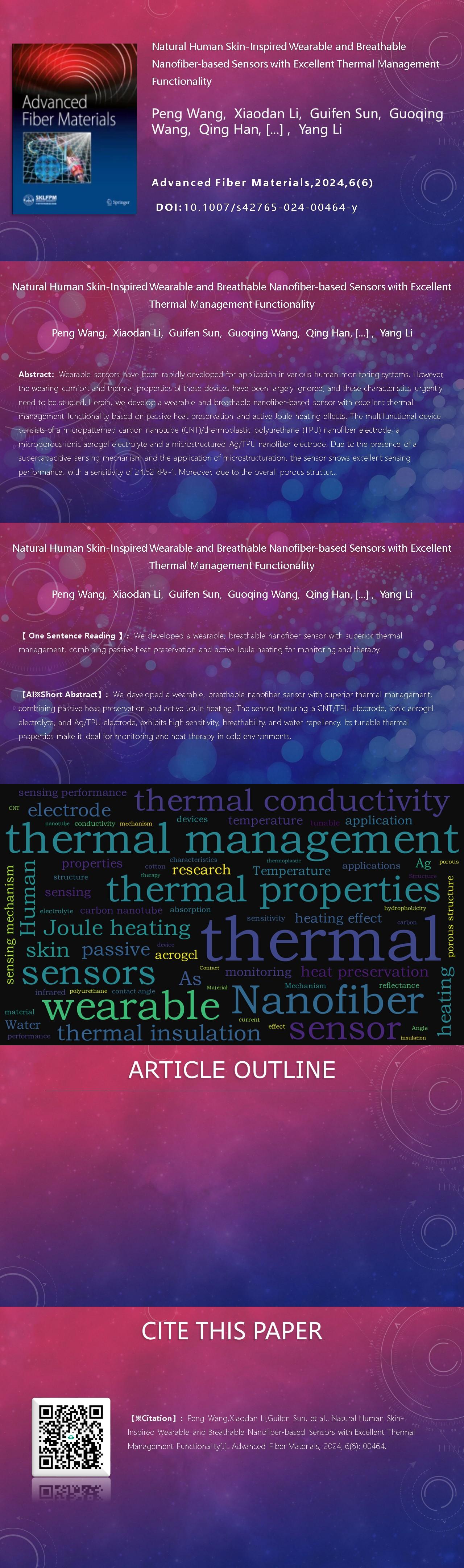Peng Wang, Xiaodan Li, Guifen Sun, Guoqing Wang, Qing Han, Chuizhou Meng, Zhonghe Wei, Yang Li. Natural Human Skin-Inspired Wearable and Breathable Nanofiber-based Sensors with Excellent Thermal Management Functionality[J]. Advanced Fiber Materials, 2024, 6(6): 00464