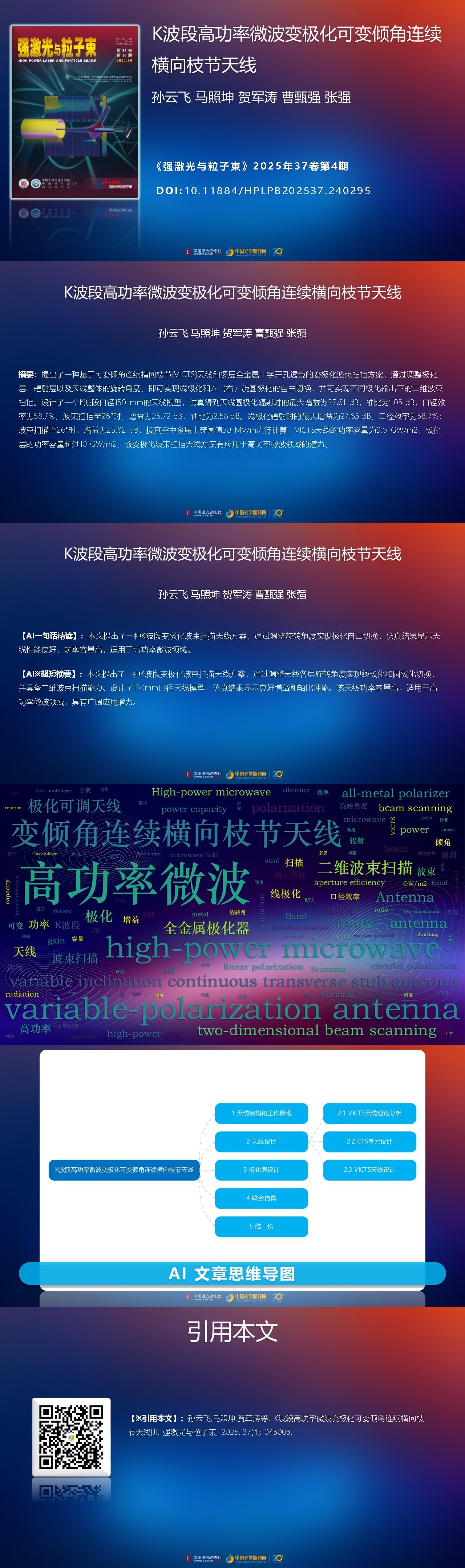Yunfei Sun, Zhaokun Ma, Juntao He, Zhenqiang Cao, Qiang Zhang. K-band high-power microwave variable-polarization antenna with variable inclination continuous transverse stub antenna[J]. High Power Laser and Particle Beams, 2025, 37(4): 043003