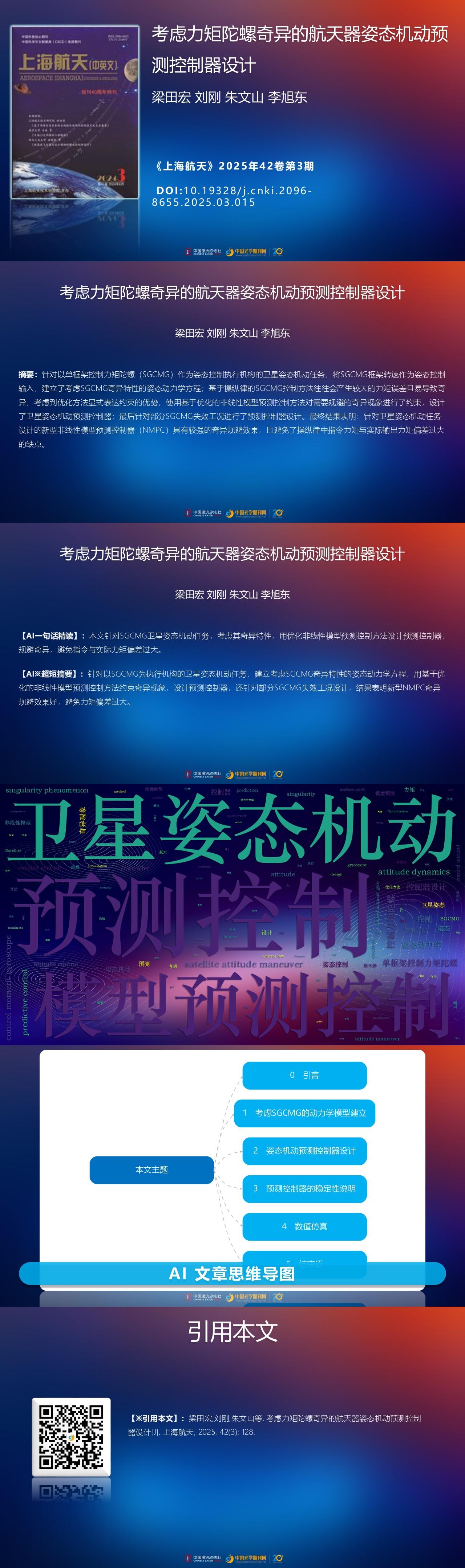 Tianhong LIANG, Gang LIU, Wenshan ZHU, Xudong LI. Design of Spacecraft Attitude Maneuvering Prediction Controller Considering Moment Gyroscope Singularity[J]. AEROSPACE SHANGHAI, 2025, 42(3): 128