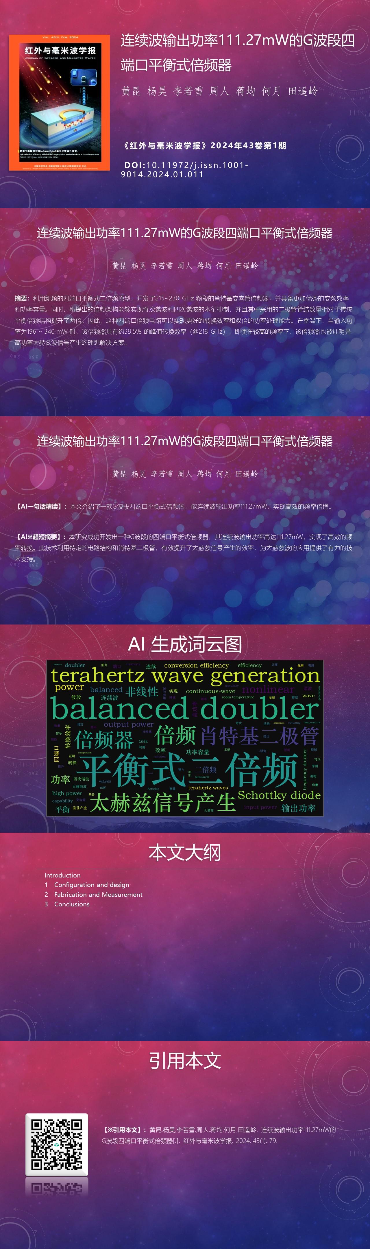 Kun HUANG, Hao YANG, Ruo-Xue LI, Ren ZHOU, Jun JIANG, Yue HE, Yao-Ling TIAN. G-band quad-port balanced multiplier with 111.27mW continuous-wave output power[J]. Journal of Infrared and Millimeter Waves, 2024, 43(1): 79