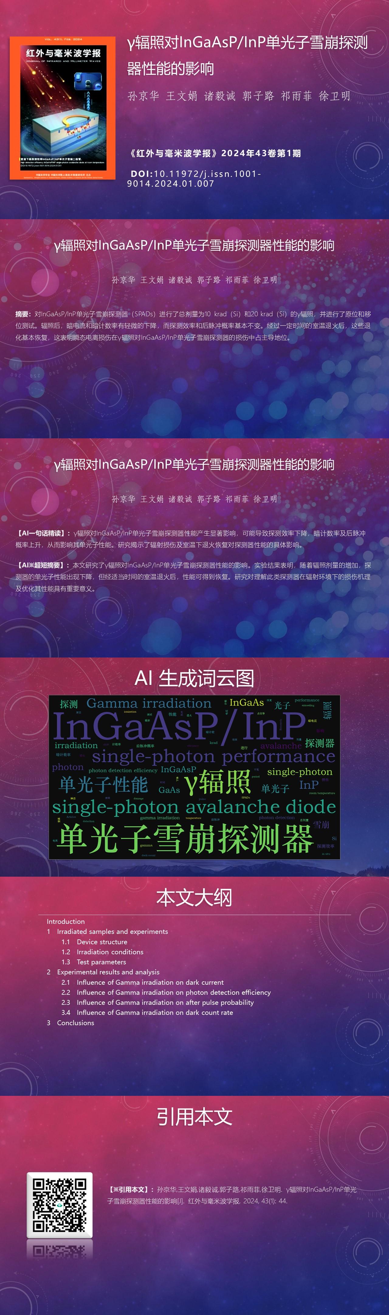 As a spatial exploration technology,remote sensing has gone through three stages:ground-based,airborne,and space-based. With increasing demands for detection distance and sensitivity in space remote sensing,infrared detectors with single-photon detection performance are urgently needed. Near-infrared InGaAs(P)/InP single-photon avalanche diodes(SPADs)have attracted wide attention in the field of space remote sensing due to small size,low power consumption,stable operation,and insensitivity to ultra-low operating temperatures[1,2]. However,in the complex space environment,many high-energy particles such as electrons,protons,neutrons,and heavy ions[3-5] create a radiation environment in which photodetectors experience displacement,total-ionization-dose,and single-event effects. These will temporarily or even permanently damage the performance of the detector,leading to performance degradation or even failure[6-9]. Therefore,in order to verify the reliability of the detector's operation in space,it is necessary to study how radiation affects device performance[10].