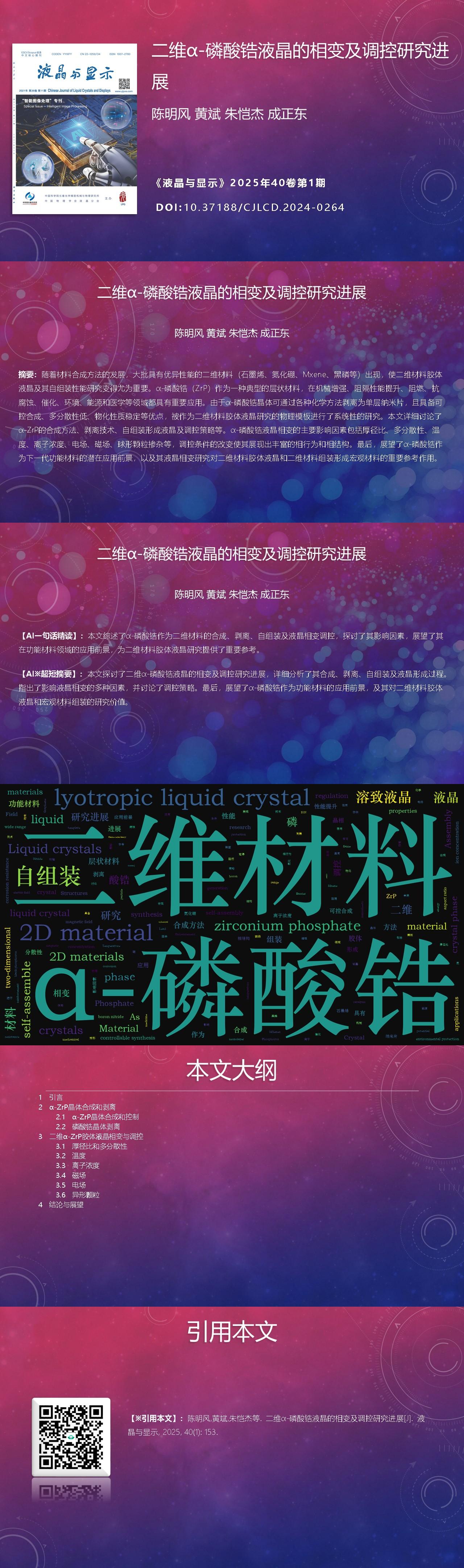 With the advancement of material synthesis methods, a wide range of two-dimensional (2D) materials with exceptional properties, such as graphene, boron nitride, MXenes, and black phosphorus, have emerged, making the study of 2D material colloidal liquid crystals and their self-assembly behaviors increasingly important. Alpha-zirconium phosphate (α-ZrP), a typical layered material, has significant applications in fields such as mechanical reinforcement, barrier enhancement, flame retardancy, corrosion resistance, catalysis, environmental protection, energy, and medicine. Due to the ability of α-ZrP crystals to be exfoliated into monolayer nanosheets through various chemical methods, and its advantages of controllable synthesis, low polydispersity, and stable physicochemical properties, α-ZrP has been systematically studied as a physical template for research on 2D material colloidal liquid crystals. This article provides a detailed discussion on the synthesis methods, exfoliation techniques, self-assembly into liquid crystals, and regulatory strategies of α-ZrP. The main factors influencing the liquid crystal phase transitions of α-ZrP include the aspect ratio, polydispersity, temperature, ion concentration, electric field, magnetic field, and spherical particle mixing. Changes in these regulatory conditions lead to diverse phase behaviors and phase structures. This article also explores the potential applications of α-ZrP as a next-generation functional material and highlights the importance of research on its liquid crystal phase transitions as a significant reference for the study of 2D material colloidal liquid crystals and the assembly of 2D materials into macroscopic structures.