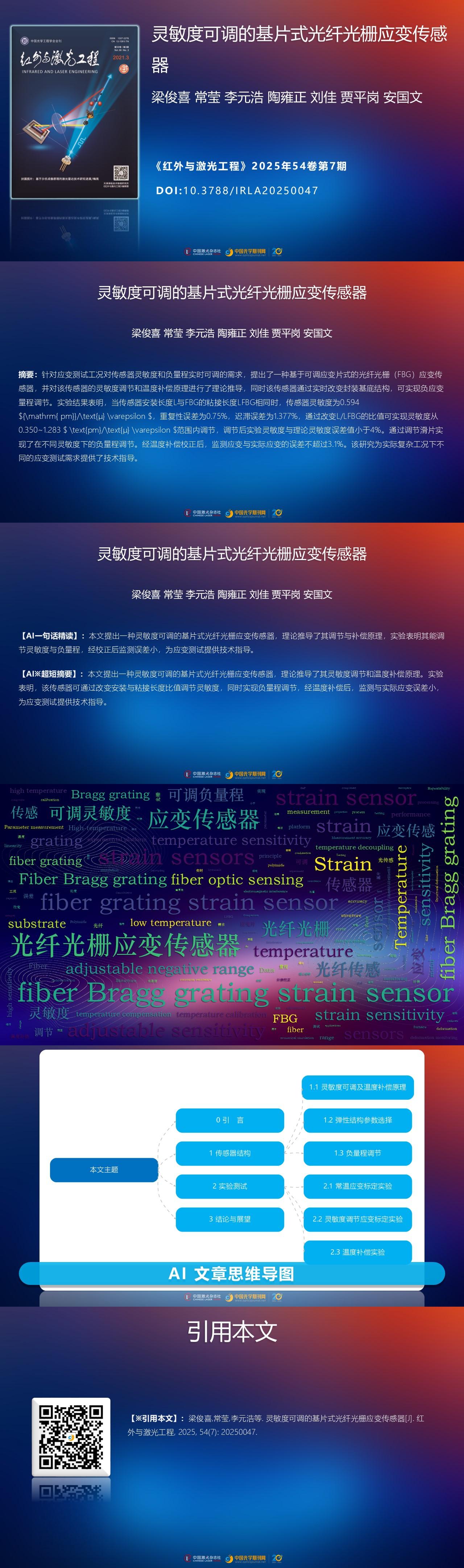 Results and DiscussionsA metal substrate FBG strain sensor based on an elastic element was designed, which has the capacity for temperature compensation. The performance of the sensor was verified using a universal testing machine, a high and low temperature chamber and a fibre optic grating demodulator. The sensor demonstrated good linearity and repeatability, which renders it easy to install and suitable for engineering structural deformation monitoring applications that require different ranges.