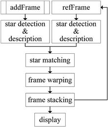 Image registration is an old topic but has a new application in deep-sky imaging fields named live stacking. In this Letter, we propose a live stacking algorithm based on star detection, description, and matching. A thresholding method based on Otsu and centralization is proposed to implement star detection. Then, a translation and rotation invariant descriptor is proposed to provide accurate feature matching. Extensive experiments illustrate that our proposed method is feasible in deep-sky image live stacking.