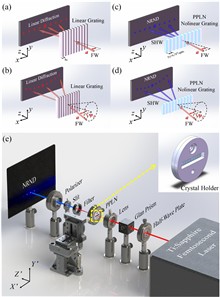 In classical linear optics, when light shines upon a grating in the normal configuration where the incident plane of light is perpendicular to the optical axis of the grating, ordinary Bragg diffraction will occur. However, when light is incident in the general conical configuration where the incident plane of light is oblique to the optical axis of the grating, the Bragg diffraction becomes much more complicated. What happens to the nonlinear diffraction of a laser beam by a nonlinear grating? In this Letter, we wish to answer this interesting and fundamental question in the realm of nonlinear optics. We shine a Ti:sapphire femtosecond pulse laser beam (with a central wavelength at 800 nm) upon a periodically poled lithium niobate (PPLN) thin plate nonlinear grating and systematically investigate the Raman–Nath nonlinear diffraction (NRND) pattern of a second-harmonic generation (SHG) laser beam in various “conical” (or off-plane) incidence configurations characterized by both the polar angle α and azimuthal angle φ. By analyzing the diffraction characteristic and uncovering the underlying mechanisms of conical NRND nonlinear diffraction, we have provided a comprehensive understanding of its spatial behavior. The study of conical nonlinear diffraction enriches the understanding of the complicated interaction between the pump laser beam and the structured nonlinear medium and broadens the arena of nonlinear optics.