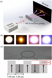 We make a comparison study of linear and nonlinear diffraction by a periodically poled lithium niobate (PPLN) dual linear–nonlinear thin-plate grating with weak surface corrugation against four types of white light sources. They are the ordinary halogen lamp thermal radiation source (WL1), the silica photonic crystal fiber supercontinuum nanosecond laser source (WL2), and two femtosecond white lasers made by a Ti:sapphire pump laser beam passing through a fused silica plate with significant spectrum broadening (WL3) and through a cascaded silica plate and a chirped PPLN crystal with ultrabroadband second-harmonic generation (WL4). The experiments show that the coherence, peak power, spectral bandwidth, profile, and flatness of the pump white light all contribute to shaping the characteristics of linear and nonlinear optical diffraction patterns. In particular, for WL1, WL2, and WL4, the peak power is not sufficiently large; thus, only linear diffraction occurs. For incoherent WL1, the interference is absent. Remarkably, when a femtosecond white laser with sufficiently large peak power (WL3) shines upon the PPLN grating, bright and sharp linear Bragg scattering spots, dispersive colored linear diffraction patterns, and nonlinear Cherenkov radiation nonlinear diffraction patterns are observed simultaneously by naked eyes. The experiments would enrich the basic physical and optical understanding of linear and nonlinear optical diffraction characteristics of ultrabroadband white laser sources.