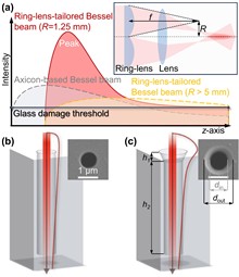 This study presents a laser-based technique for fabricating nano-holes with tunable axial morphology on fused silica using ring-lens-tailored Bessel beams. Unlike conventional axicon-based Bessel methods, this approach effectively controls the beam’s axial intensity peak by simply adjusting the ring-lens radius (R). By combining theoretical simulation and experimental validation, we demonstrate that the nano-hole morphology can be precisely tuned by modulating the beam’s initial energy peak. A taper entrance can be formed, with the taper angle effectively controlled within 52° by adjusting R from 1.25 to 2.50 mm. When R exceeds 2.50 mm, the axial energy distribution becomes uniform and leads to the disappearance of the taper, resulting in a standard cylindrical hole and offering a clear process window for controlling the nano-hole morphology. This single-pulse ablation method advances precision nano-manufacturing by enabling the efficient fabrication of customized nano-holes, with potential applications in photonics, microfluidics, and other nano-engineering fields.