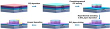A monolithic integrated ultraviolet-infrared (UV-IR) dual-color photodetector based on graphene/GaN heterojunction was fabricated by vertically integrating a GaN nanowire array on a silicon substrate with monolayer graphene. The device detects UV and IR lights by different mechanisms. The UV detection is accomplished by the forbidden band absorption of GaN, and the IR detection is realized by the free electron absorption of graphene. At peak wavelengths of 360 nm and 1540 nm, the detector has responsivities up to 6.93 A/W and 0.11 A/W, detection efficiencies of 1.23 × 1012 cm·Hz1/2 ·W-1 and 1.88 × 1010 cm·Hz1/2 ·W-1, respectively, and a short response time of less than 3 ms.
