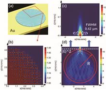 We propose a metalens for coaxial double wavelength focusing. One focusing spot is a circular solid spot, and the other focusing spot is a doughnut-shaped spot that is circling the solid spot. The designed metalens was composed of a meta-molecular nanostructured cell array. Each meta-molecular nanostructured cell was divided into four squares. Two slots with exactly the same shape, but usually with the rotation angle measured clockwise from the positive x axis, are etched into the gold film in two diagonally connected squares. Another two slots with the same shape but with the rotation angle measured counter-clockwise from the positive x axis are etched into another two diagonally connected squares in the same cell. The lasers with two different wavelengths are transformed into right-handed and left-handed circularly polarized beams, respectively. The two sets of slots with different azimuthal rotations modulated the phases of incident right-handed and left-handed circularly polarized beams independently. The numerical simulation with finite-difference time-domain (FDTD) software was carried out, and the experimental verification was also implemented. Both the experimental result and the numerical simulation agree well with the theoretical design.