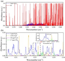 A hydrogen peroxide (H2O2) detection system is demonstrated with multi-pass tunable diode laser absorption spectroscopy using a 75 m Herriott absorption cell. The system utilizes an ∼8 µm continuous wave distributed feedback quantum cascade laser (CW DFB-QCL) targeting a prominent H2O2 line at 1253.1 cm-1 within the fundamental absorption band. A wavelength modulation spectroscopy with the first harmonic normalized second harmonic (WMS-2f/1f) detection method is employed to eliminate laser light intensity fluctuations. Calibration of the system is conducted by means of chemical titration to establish the correlation between the peak value of the 2f/1f signal and H2O2 concentration. An Allan–Werle deviation analysis shows that a minimum detection limit (MDL) of 2.9 ppb (1 ppb = 10-9) for H2O2 is achieved with an average time of 147 s. To the best of our knowledge, this is the lowest detection limit for H2O2 at the wavenumber of 1253.1 cm-1. The system exhibits robust resistance to interference from other gases, especially water vapor (H2O), making it suitable for measuring the residual concentration of H2O2 post-sterilization and the concentration of H2O2 in the atmosphere.