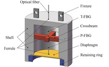 For the field of ocean depth detection, a small volume diaphragm-type fiber Bragg grating pressure sensor with a temperature compensation structure is made. The length and diameter of the fiber Bragg grating pressure sensor are approximately 40 mm and 20 mm, respectively. The diaphragm-type fiber Bragg grating pressure sensor with a temperature compensation structure uses an ultrashort fiber Bragg grating string. There are two fiber Bragg gratings on the ultrashort fiber Bragg grating string. The length of the two fiber Bragg gratings is 1 mm, and the interval between them is 20 mm. One fiber Bragg grating is used to measure pressure, and the other fiber Bragg grating is only affected by temperature, which can eliminate the influence of temperature on the pressure measuring fiber Bragg grating. The optical fiber is encapsulated in a metal tube a short distance away from the measuring pressure fiber Bragg grating. The end of the metal tube is fixed on the elastic metal diaphragm by a laser welding process. In this way, the optical fiber and metal diaphragm are not fixed by epoxy adhesive directly, which can avoid the influence of aging and creep of epoxy adhesive on the performance of the diaphragm-type fiber Bragg grating pressure sensor with a temperature compensation structure. In the measuring range of 0.6 MPa, the theoretical pressure sensitivity of the diaphragm-type fiber Bragg grating pressure sensor with a temperature compensation structure is -1.214 nm/MPa, and the pressure sensitivity of the diaphragm-type fiber Bragg grating pressure sensor with a temperature compensation structure obtained by the finite element analysis method is -1.364 nm/MPa. After the diaphragm-type fiber Bragg grating pressure sensor with a temperature compensation structure is fabricated, the pressure and temperature characteristics of the sensor are tested. With the help of a fiber Bragg grating only affected by temperature, the influence of temperature on the pressure measuring fiber Bragg grating is eliminated through calculation. The actual average pressure sensitivity of the diaphragm-type fiber Bragg grating pressure sensor with a temperature compensation structure is -1.728 nm/MPa. Moreover, the linearity of the boost and buck curves of the diaphragm-type fiber Bragg grating pressure sensor with a temperature compensation structure is more than 99.9%, and the boost and buck curves of the diaphragm-type fiber Bragg grating pressure sensor with a temperature compensation structure also coincide well. In addition, the best way of the tail fiber seal, the reason of the different temperature response characteristics of the double fiber grating, the method of improving the linearity and coincidence degree of the pressure curve, the reason and solution of affecting the stability of the sensor, and the reason of improving the sensitivity of the measured pressure are discussed. First, when the thickness of the metal tube that encapsulates the optical fiber is relatively thin, comparative experiments show that the method of sealing the fiber tail with epoxy glue is better than laser welding. By sealing the fiber tail with epoxy glue, the wavelength shift of the fiber Bragg grating can reach 2 nm. It can be seen that sealing the tail of the optical fiber with epoxy glue more easily maintains the prestress applied to the optical fiber. Second, a temperature response test experiment of a diaphragm-type fiber Bragg grating pressure sensor with a temperature compensation structure is carried out. The experimental results show that the temperature response of the fiber Bragg grating and pressure response of the fiber Bragg grating are slightly different. Combined with the simulation analysis, it is found that the main reason for the difference in the temperature response trend of dual fiber Bragg gratings is the defect of the structural design. Third, to improve the linearity and coincidence of the boost and buck curves of the sensor, temperature and pressure aging processes are added to the sensor manufacturing process. The experimental results show that these methods are effective. Next, considering the influence of an optical fiber tail wobble on the stability of a diaphragm-type fiber Bragg grating pressure sensor with a temperature compensation structure, it is suggested to use apodisated linearly chirped fiber gratings or set up a region to isolate external forces to solve the problem. Finally, the problem that the actual pressure sensitivity of a diaphragm-type fiber Bragg grating pressure sensor with a temperature compensation structure is higher than the theoretical value is discussed from several angles. The main reasons are that the effective length of the fiber Bragg grating decreases due to the flow of epoxy glue and the pressure sensitivity of the fiber Bragg grating increases due to the increase in prestress.