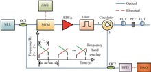 To enhance the bandwidth and real-time capabilities of Radio Frequency (RF) spectrum analysis, the optical real-time Fourier transform method has been proposed. The optical real-time Fourier transform method based on the temporal Talbot effect has the advantage of a simple structure by using optical pulse sampling and dispersion delay structure. However, its frequency measurement bandwidth is limited by the optical pulse's repetition rate. Addressing this limitation, a real-time spectrum analysis scheme of wideband RF signals based on the fractional temporal Talbot effect is proposed and demonstrated. Based on the sampling and dispersion structure, the scheme realizes the mapping of the RF signal frequency to the optical pulse time interval. At the same time, the repetition rate of the optical pulse before sampling is multiplied by passing through a dispersive element satisfying the fractional Talbot distance in advance. The frequency measurement bandwidth of the system can be significantly improved by using the fractional Talbot effect. A proof-of-concept experiment is carried out to test the performance of the proposed scheme. The repetition period of the optical pulse is set to 151.5 ps, that is, the repetition frequency is 6.6 GHz. Each pulse has a Gaussian shape and the full width at half maximum of the pulse is approximately 30 ps. Dispersion compensation fiber is used to provide dispersion for the system. The total dispersion value of the two sections of dispersion is about 3 650 ps2, which is about 0.1% different from the theoretical result. The RF signal to be measured is generated by a RF signal generator. The output optical signal is converted into an electrical signal by a 40 GHz bandwidth photodetector and recorded by a sampling oscilloscope with a bandwidth of 50 GHz. Comparing the experimental results under integer-order, 3rd-order fractional, and 9th-order fractional temporal Talbot conditions, it is verified that the measurement frequency bandwidth of the system increases with the order of the temporal Talbot effect. Real-time spectral analysis of single-tone and two-tone RF signals within a 29.7 GHz bandwidth is achieved using the 9th-order fractional temporal Talbot effect. Numerical simulation is carried out to achieve time-frequency analysis of a large-bandwidth linear chirp signal. Based on the 3rd-order fractional temporal Talbot effect, a linear chirp signal with a frequency range of 2~13 GHz and a chirp rate of 2.2 GHz/ns is successfully identified. Numerical simulation results further verify that this scheme can effectively analyze frequency transient signals. The main causes of frequency measurement errors include the time jitter of the input optical pulse train, the limited bandwidth of the pulse detection system, the deviation between the dispersion value and the theoretical value, high-order dispersion terms, etc. In the experiment, the time jitter root mean square value of the optical pulse is approximately 1 ps, which is 0.066% of the period of the optical pulse train. When the frequency measurement bandwidth is 29.7 GHz, the frequency measurement error caused by the time jitter is about 200 MHz. In order to improve frequency measurement accuracy, methods such as reducing optical pulse jitter, increasing the bandwidth of the pulse detection system, and compensating for high-order dispersion can be used. It should be noted that the increase of frequency measurement bandwidth will sacrifice the frequency resolution of the system. In practical applications, the requirements of system bandwidth and frequency resolution should be fully considered to select the order of the fractional temporal Talbot effect. With its advantages of simple structure, large bandwidth, and real-time processing, this scheme has potential application value in the fields of broadband radar, cognitive radio, and other fields.