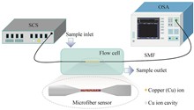 Copper is a necessary trace element in the human body, with adults requiring about 2 mg per day. Functional materials containing Cu2? bring great convenience to life, but their released Cu2? from these materials are harmful to human health and the environment. Regulators have proposed allowable emission standards for copper (Ⅱ), among which “Drinking Water Sanitation Standard” (GB5749-2022) specifies 1.0 mg/L, with stricter standards in industrial emissions and sewage treatment plant pollutant discharge standards. The “Iron and Steel Industry Water Pollutant Discharge Standard” (GB13456-2012) sets 0.5 mg/L, while fishery requirements are the strictest under “Fishery Water Quality Standard of the People's Republic of China” (GB11607-89) limiting 0.01 mg/L. These regulations underscore the need for sensitive and selective detection of low concentrations of Cu2? for environmental, industrial, and human health applications.In this study, a tapered optical fiber sensor coated with CS-PVA composite coating is designed. The micro/nanostructure consists of a single-mode tapered optical fiber sensor whose tapered region generates evanescent waves. High-sensitivity detection of Cu2? in aqueous solution was achieved through coating a CS-PVA polymer composite film on the surface of the fiber's waist-cone region. Ion imprinting technology was applied to enhance the sensor, using glutaraldehyde as a crosslinker to strengthen the polymer network through the crosslinking agent, thereby enhancing metal ion adsorption. Regeneration using hydrochloric acid induces protonation of amine groups, creating repulsion between NH?? and adsorbed Cu2? for release.The ion-imprinted sensor demonstrated specificity when exposed to Cu2?, Cd2?, Fe3?, Co2?, and Pb2? confirming selective Cu2? detection. While the sensor primarily detects Cu2?, it could be adapted for other heavy metal ions through polymer template modification, showing great potential in heavy metal detection across environmental monitoring, industrial effluent testing and remote monitoring.Within 0~100 μmol/L Cu2?, the sensor reached 85.131 6 pm·μmol?1·L sensitivity with a limit of detection (LOD) of 0.388 μmol/L and linear response (R2=0.980 76). The improved ion-imprinted sensor exhibited specificity toward Cu2??. This easily fabricated sensor combines operational simplicity with high Cu2?? sensitivity while maintaining adaptability for other heavy metal ions through template ion substitution.The growing industrial demand underscores the importance of reliable Cu2?? detection for environmental and human health. We developed a simple, yet sensitive fiber-optic sensor for Cu2??. Three sensor configurations were fabricated via dip-coating: uncoated, CS-PVA-coated, and CS-PVA ion-imprinted variants. Experimental results demonstrate that, within 0~100 μmol/L Cu2?? concentrations, the CS-PVA-coated sensor achieved 85.131 6 pm·μmol?1·L sensitivity, an LOD of 0.388 μmol/L, and linear response (R2=0.980 76). The improved ion-imprinted sensor showed specificity toward Cu2?. Combining ease of fabrication with operational simplicity, this platform enables specific Cu2? detection while remaining adaptable for other heavy metal ions through imprinting modifications.