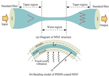 The vocal cords serve as the primary organ responsible for human vocalization. The vibrational signals generated by the vocal cords carry abundant textual information, much like those of speech signals. Vocal cord vibration recognition technology has the potential to effectively address the fundamental communication challenges encountered in the daily lives of individuals with language disorders. The utilization of flexible pressure sensors enables the detection of vocal cord vibrations and facilitates the discrimination of subtle variations within these vibrations. However, traditional electrical sensors are plagued by issues such as parasitic effects and electromagnetic interference, which significantly restrict their practical application in the detection of vocal cord vibration signals. In contrast, fiber optic sensors, particularly Micro-Nano Fiber (MNF) sensors, are more apt for detecting vocal cord vibrations owing to their small size, rapid response speed, and high sensitivity.At present, some researchers are engaged in using MNF for vocal cord recognition studies, although the intelligent classification and recognition of vibration signals as corresponding speech information has not yet been accomplished. Integrating wearable devices with deep learning presents a novel approach to accurately recognizing vocal cord vibration signals. This paper designs and fabricates a wearable flexible sensor featuring an S-shaped MNF, which consists of two layers of polydimethylsiloxane (PDMS) films with an S-shaped bent MNF embedded within it. The S-shaped MNF structure enlarges the contact area between the optical fiber and the vocal cords, thereby augmenting the efficiency and sensitivity of vocal cord vibration signal acquisition, enabling the capture of more stable and accurate signals. Additionally, this design makes the optical fiber's mode field more susceptible to vocal cord vibrations. When the vocal cords vibrate, the curved sections of the S-shaped structure experience minute displacements and deformations. These changes lead to substantial variations in the phase and intensity of the optical signals within the S-shaped MNF, which contain characteristic information regarding the vocal cord vibrations. Furthermore, combining the S-shaped MNF with flexible PDMS material effectively prevents local pressure or damage to the vocal cords during use, thus enhancing the safety and repeatability of the sensor. Subsequent in-depth simulation studies disclose that the evanescent field of the MNF increases as the MNF diameter and bending radius decrease. To balance the strength of the optical fiber with the contact area, the optimal sensor parameters were ultimately determined, specifically an MNF diameter of 4 μm and a bending radius of 1 mm.In terms of performance evaluation, this article has comprehensively investigated the response of MNF flexible sensors to both static and dynamic pressure as well as vibration. Experimental results show that the sensor's response time (222 ms) and recovery time (163 ms) are both under 300 ms, thereby demonstrating its rapid responsiveness to external stimuli and excellent durability. Across different frequencies, the sensor displays significant response variations at each test frequency, indicating strong frequency adaptability. In vocal cord vibration recognition, the sensor is worn in the vocal cord region of the human body. When the subject utters a sound, the vibrations of the vocal cords lead to changes in the transmitted light intensity of the sensor. A photodetector (PD, CONOUER, 200 kHz) converts the light intensity into corresponding electrical signals in real-time, and these signals are then transmitted to an oscilloscope for display and monitoring. The subject is required to repeatedly pronounce the 26 English letters, facilitating the acquisition of precise light-intensity spectral responses. A total of 1 660 datasets are obtained and combined with the target detection algorithm (YOLOv8) for the classification and recognition of vocal cord vibration signals, achieving an average recognition accuracy of 96.8%. To further assess the sensor's universality, vocal cord vibration data for four commonly used high-frequency phrases—“Ni Hao”, “Zao Shang Hao”, “Hello”, and “How Are You”—were collected from ten participants (5 males, 5 females). The YOLOv8 model was used to train and recognize 1 200 collected datasets. Among these phrases, the recognition accuracy for “How Are You” was the highest at 99%, with an average recognition accuracy across all phrases being 97.75%. These results suggest that the sensor attains high recognition accuracy across multiple individuals, highlighting its strong generalization capability. To comprehensively showcase the advantages of the proposed flexible wearable sensor based on MNF combined with deep learning technology, a detailed comparison was carried out with other sensors paired with different deep learning models regarding accuracy. The results disclose that the S-shaped MNF sensor combined with the YOLOv8 model used in this study achieves high accuracy in recognizing various characteristic signals (26 English letters). Moreover, even with 10 test subjects, the model maintains outstanding accuracy in identifying four commonly used phrases. Therefore, the proposed approach not only surpasses other methods in terms of accuracy but also exhibits significant advantages in meeting diverse requirements and demonstrating broad applicability.This study designs and fabricates a flexible wearable sensor that is based on a PDMS-encapsulated S-shaped MNF structure for the recognition of vocal cord vibration signals. Through theoretical modeling, simulation, and analysis, the main structural parameters of the sensor are rationally designed in order to achieve high sensitivity, reliability, and applicability. By utilizing the YOLOv8 deep learning model, the sensor successfully recognizes 26 English let