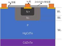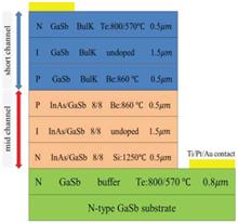 Using GaSb bulk and InAs/GaSb superlattice as short wave and medium wave infrared absorbing materials respectively, a short/mid dual-band infrared detectors with NIPPIN structure were epitaxial growth and fabricated. HRXRD and AFM tests show the FWHM of zero order peak of InAs/GaSb superlattice and GaSb peak are 17.57 arcsec and 19.15 arcsec, respectively. Surface root mean square roughness RMS is 1.82? under 10 μm×10 μm. At 77 K, the maximum product RA of resistance and area of SiO2 passivated device is 5.58×105 Ω?cm2, the dark current density is 5.27×10-7 A?cm-2, and side wall resistivity is 6.83×106 Ω?cm. After anodic sulfuration, the maximum RA of the device is 1.86×106 Ω?cm2, the dark current density is 4.12×10-7 A?cm-2, and side wall resistivity is 4.49×107 Ω?cm. Sulfurization reduces dark current of the device by more than one order of magnitude and increases side wall resistivity by one order of magnitude under the same bias. The spectral response of the sulfurization device was tested, the device has the bais polarity-dependent dual-band detection performance with low crosstalk. The 50% cutoff wavelengths of the short-wave and medium-wave channels are 1.55 μm and 4.62 μm, respectively. At 1.44 μm, 2.7 μm and 4 μm,the responsivity are 0.415 A/W, 0.435 A/W and 0.337 A/W, respectively.