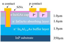 Planar-type 2.2 μm wavelength-extended InGaAs photodetectors (PDs) using the sealed-ampoule diffusion method was reported. The zinc arsenide powder was used as the dopant source, which was driven into the cap of the In0.75Al0.25As/In0.75Ga0.25As/In0.75Al0.25As hetero structure materials grown by molecular beam epitaxy (MBE), using a SiNx as diffusion mask deposited by ICP-CVD. The junction depth, the lateral collection width of photogenerated carriers, the I-V characteristics, the spectral response and the detectivity of the detector at different temperatures were analyzed. The results indicate that the PD exhibits a low dark current density of 0.69×10-9 A/cm2 at -10 mV at 150 K. The cutoff wavelength and peak wavelength were 2.12 μm and 1.97 μm. The peak detectivity, peak responsivity and quantum efficiency was 1.01×1012 cm·Hz1/2/W, 1.29 A/W and 82% respectively. These results suggest that the planar-type InGaAs can reach high performance.