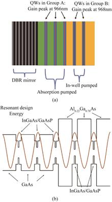 Optically pumped dual-wavelength vertical external cavity surface-emitting semiconductor laser (VECSEL) with a single gain chip is reported. The active region of the gain chip is composed of two groups of quantum wells with different lasing wavelengths, one group of quantum wells with shorter wavelength operates by absorption pumping, and the other group of quantum wells with longer wavelength operates by in-well pumping. When the VECSEL is operating, the short-wavelength quantum wells pumped by the absorption region are first lased, due to the intensity modulation effect of the long-wavelength quantum wells on the short-wavelength quantum wells, it can be observed that the peak intensity of the spectrum oscillates periodically with time, pulsed operation of the VECSEL was observed by the highly sensitive detector. With the increasing of the pump power, stable dual-wavelength emission was achieved, the peak positions of emission wavelength are 967.5 nm and 969.8 nm respectively. The output power of the stable dual-wavelength emission can reach 560 mW, and the far fields show Gaussian cross-sections in orthogonal dimensions, and the divergence angles of 6.68° and 6.87° are obtained.