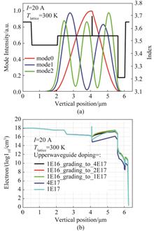 The considerations in the epitaxial and longitudinal design of a supper-large-optical-cavity structure diode laser in the 976-nm band are numerically studied and presented here. Mode control layers were designed underneath and up the quantum well layer to suppress the lasing of high-order transverse modes. The electron leakage was suppressed by a band energy engineering, where the electron barrier increases from the p-waveguide layer to the p-cladding layer. The optimized structure has an internal loss of 0.66 cm-1, an internal quantum efficiency of 0.954, and a full width at half maximum vertical far-field angle of 17.4°. For the resonant cavity design, a liner current profile along the cavity was proposed to reduce the longitudinal spatial hole burning effect, where a power penalty of 1.0 W at 20 A is suppressed. The 4-mm-long and 100 μm wide broad-area single emitter with the supper-large-optical-cavity epitaxial structure was designed to have a high power-efficiency of about 71% at an output power of 21 W under continuous current injection at 25°C.