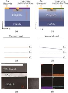 “Ga-free” strain-balanced InAsP/InAsSb superlattices grown on InAs substrate by Metal Organic Chemical Vapor Deposition(MOCVD)was proposed and implemented to explore its feasibility as an infrared absorption material. First, the band gaps of InAsP/InAsSb superlattices were calculated by k·p method, and it was found that their cut-off wavelength cover mid-wavelength infrared to long wave infrared region. Then, InAs0.8P0.2/InAs0.7Sb0.3 superlattices were chosen and grown on InAs substrate by MOCVD. XRD measurement shows that the lattice mismatches between the InAs substrate peak and 0th order satellite peak of superlattices is only 61", indicating strain balance condition is achieved. AFM test for surface morphology shows its root mean square roughness is only 0.4 nm for 5×5 μm2 regions. The low-temperature PL spectra shows strong superlattice emission with peak located around 3.3 μm, which is closed to the design value. All the results indicate the feasibility and practicality of strain balanced InAsP/InAsSb superlattices grown by MOCVD for infrared detection.